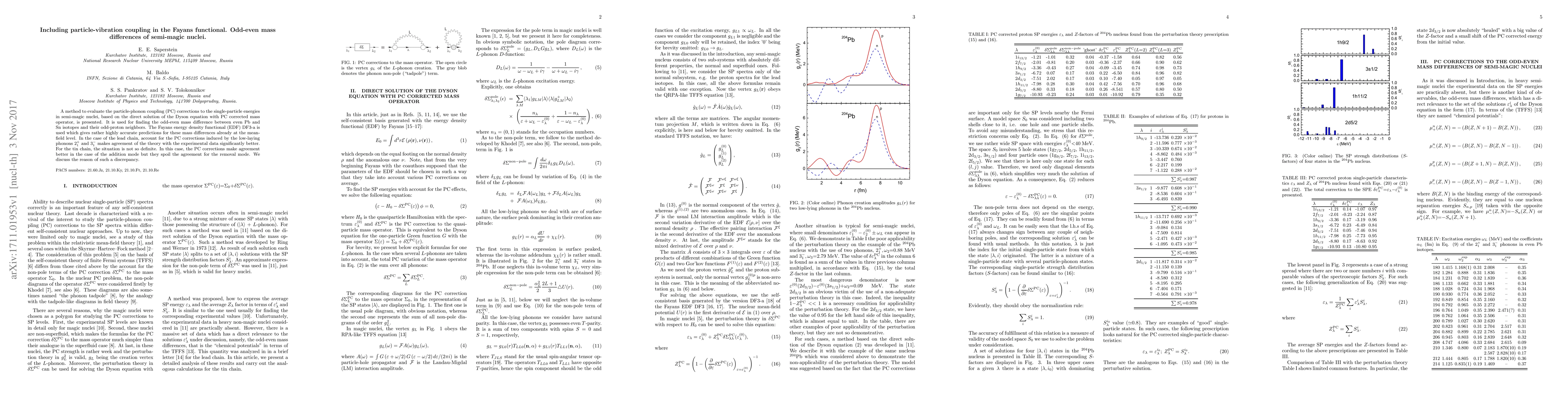This paper presents a method for evaluating particle-phonon coupling corrections to single-particle energies in semi-magic nuclei, improving the Fayans functional. It finds that these corrections significantly enhance agreement with experimental data for odd-even mass differences in Pb isotopes, though effects are less clear for Sn isotopes.