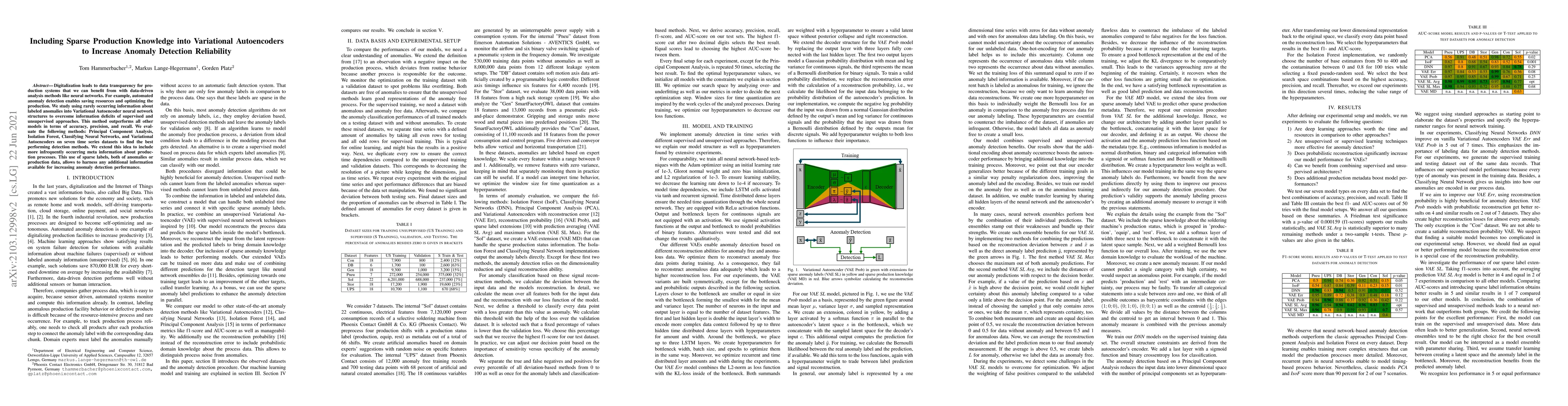 This paper explores integrating sparse production knowledge into Variational Autoencoders to enhance anomaly detection in production systems. The proposed method outperforms traditional models like PCA, Isolation Forest, and neural networks, achieving higher accuracy, precision, and recall by leveraging infrequently occurring labeled anomaly data.