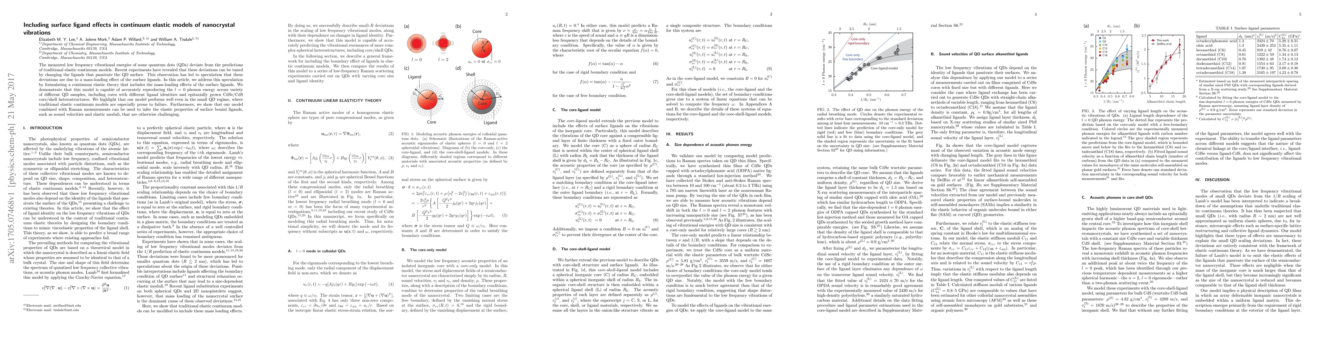 The measured low frequency vibrational energies of some quantum dots (QDs) deviate from the predictions of traditional elastic continuum models. Recent experiments have revealed that these deviations can be tuned by changing the ligands that passivate the QD surface. This observation has led to speculation that these deviations are due to a mass-loading effect of the surface ligands. In this article, we address this speculation by formulating a continuum elastic theory that includes the mass-loading effects of the surface ligands. We demonstrate that this model is capable of accurately reproducing the $l = 0$ phonon energy across variety of different QD samples, including cores with different ligand identities and epitaxially grown CdSe/CdS core/shell heterostructures. We highlight that our model performs well even in the small QD regime, where traditional elastic continuum models are especially prone to failure. Furthermore, we show that our model combined with Raman measurements can be used to infer the elastic properties of surface bound ligands, such as sound velocities and elastic moduli, that are otherwise challenging.