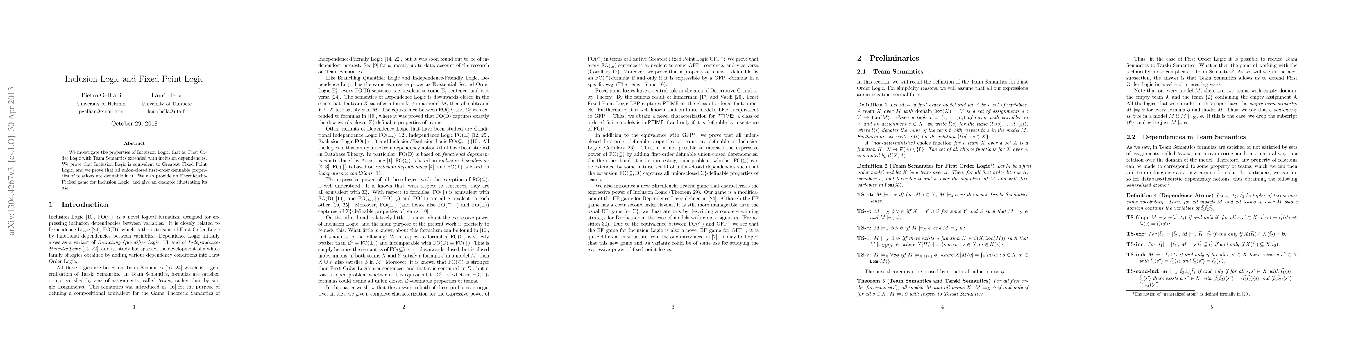 This paper examines Inclusion Logic, which extends First Order Logic with Team Semantics and inclusion dependencies. It demonstrates the equivalence of Inclusion Logic to Greatest Fixed Point Logic and proves that it can define all union-closed first-order definable properties of relations. Additionally, it introduces an Ehrenfeucht-Fraissé game for Inclusion Logic and provides an example of its application.