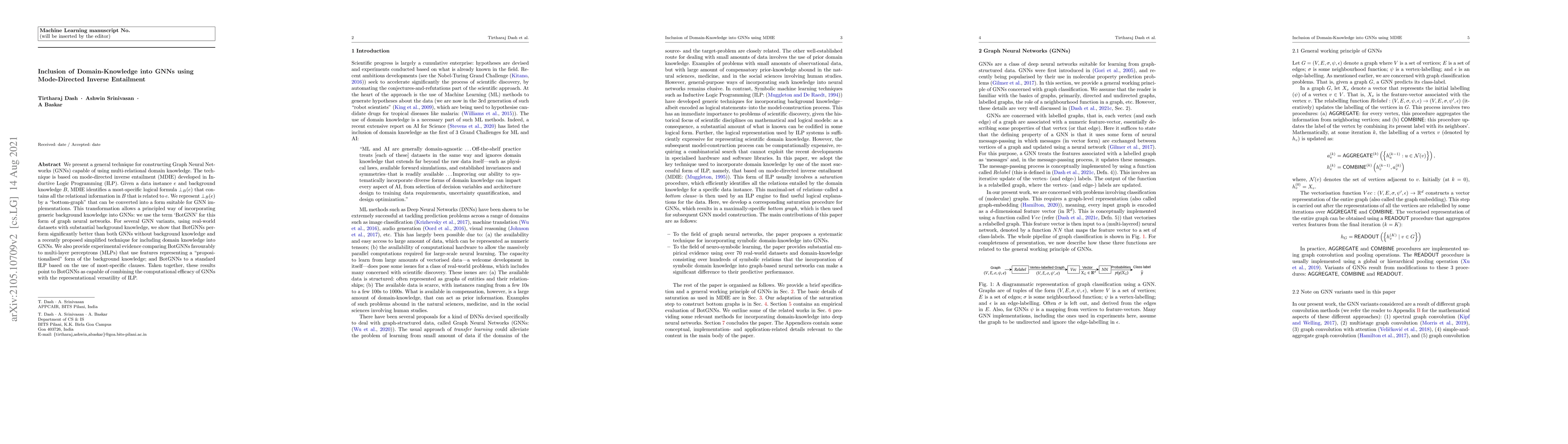We present a general technique for constructing Graph Neural Networks (GNNs) capable of using multi-relational domain knowledge. The technique is based on mode-directed inverse entailment (MDIE) developed in Inductive Logic Programming (ILP). Given a data instance $e$ and background knowledge $B$, MDIE identifies a most-specific logical formula $\bot_B(e)$ that contains all the relational information in $B$ that is related to $e$. We represent $\bot_B(e)$ by a "bottom-graph" that can be converted into a form suitable for GNN implementations. This transformation allows a principled way of incorporating generic background knowledge into GNNs: we use the term `BotGNN' for this form of graph neural networks. For several GNN variants, using real-world datasets with substantial background knowledge, we show that BotGNNs perform significantly better than both GNNs without background knowledge and a recently proposed simplified technique for including domain knowledge into GNNs. We also provide experimental evidence comparing BotGNNs favourably to multi-layer perceptrons (MLPs) that use features representing a "propositionalised" form of the background knowledge; and BotGNNs to a standard ILP based on the use of most-specific clauses. Taken together, these results point to BotGNNs as capable of combining the computational efficacy of GNNs with the representational versatility of ILP.