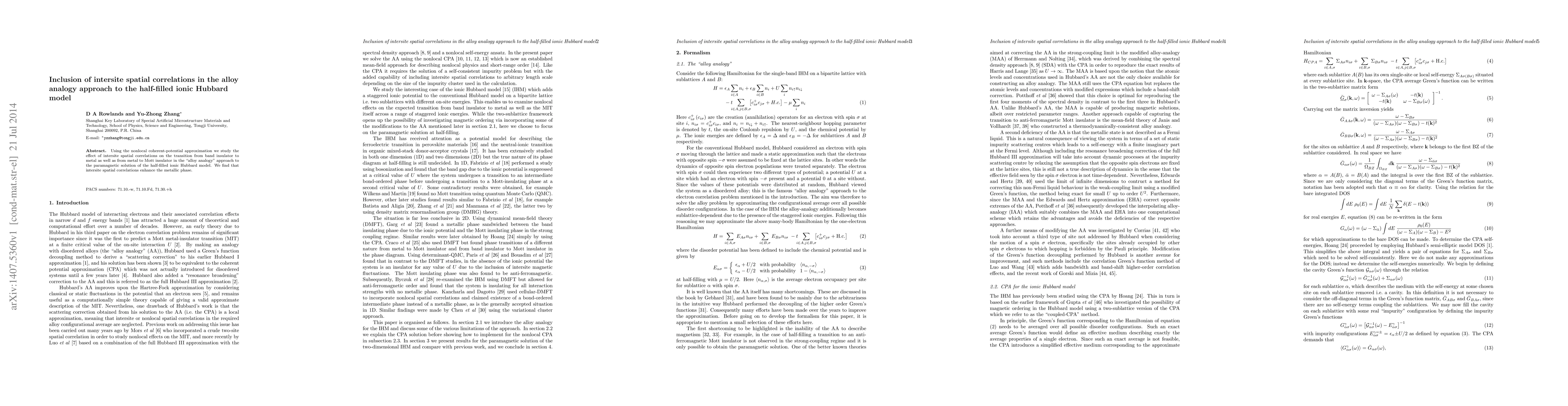 Summary: This study employs the nonlocal coherent-potential approximation to examine how intersite spatial correlations affect the phase transitions in the alloy analogy approach to the half-filled ionic Hubbard model, revealing that these correlations strengthen the metallic phase.