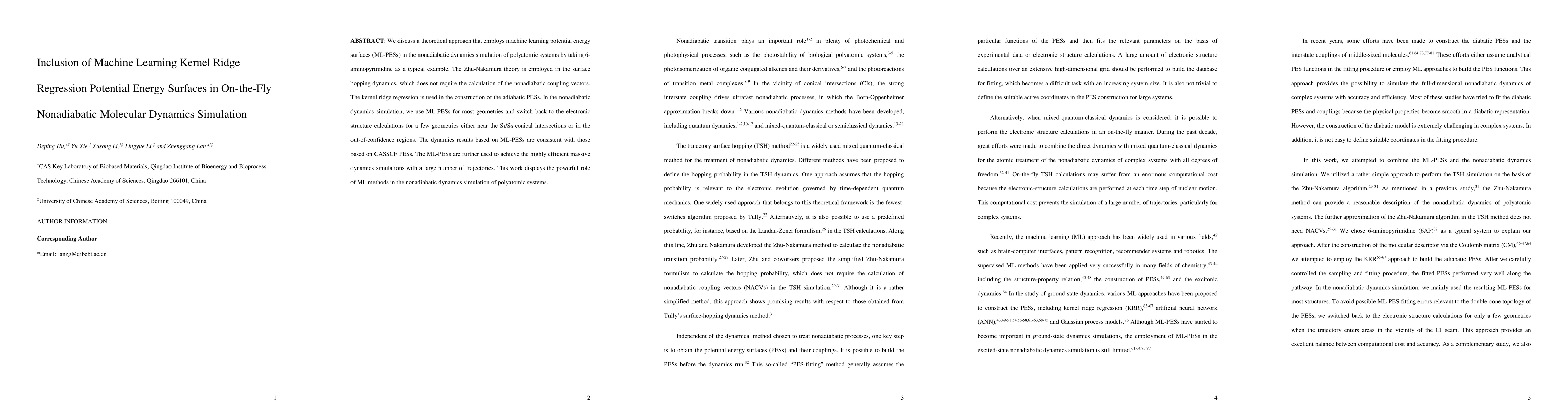 We discuss a theoretical approach that employs machine learning potential energy surfaces (ML-PESs) in the nonadiabatic dynamics simulation of polyatomic systems by taking 6-aminopyrimidine as a typical example. The Zhu-Nakamura theory is employed in the surface hopping dynamics, which does not require the calculation of the nonadiabatic coupling vectors. The kernel ridge regression is used in the construction of the adiabatic PESs. In the nonadiabatic dynamics simulation, we use ML-PESs for most geometries and switch back to the electronic structure calculations for a few geometries either near the S1/S0 conical intersections or in the out-of-confidence regions. The dynamics results based on ML-PESs are consistent with those based on CASSCF PESs. The ML-PESs are further used to achieve the highly efficient massive dynamics simulations with a large number of trajectories. This work displays the powerful role of ML methods in the nonadiabatic dynamics simulation of polyatomic systems.