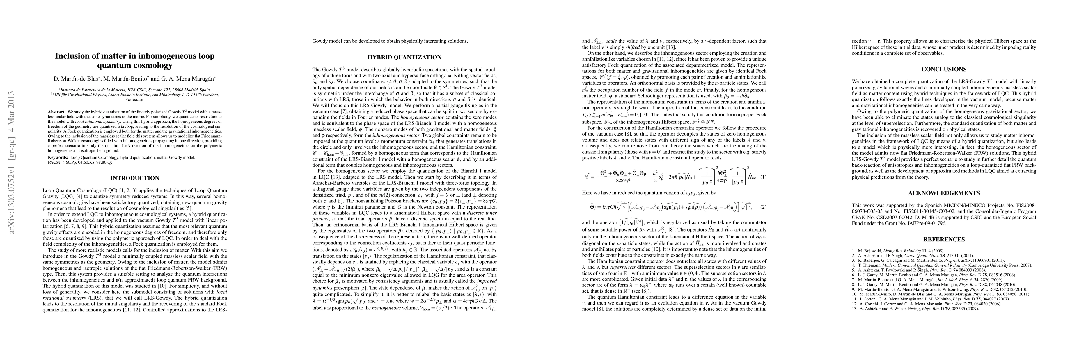 We study the hybrid quantization of the linearly polarized Gowdy $T^3$ model with a massless scalar field with the same symmetries as the metric. For simplicity, we quantize its restriction to the model with local rotational symmetry. Using this hybrid approach, the homogeneous degrees of freedom of the geometry are quantized \`a la loop, leading to the resolution of the cosmological singularity. A Fock quantization is employed both for the matter and the gravitational inhomogeneities. Owing to the inclusion of the massless scalar field this system allows us to modelize flat Friedmann-Robertson-Walker cosmologies filled with inhomogeneities propagating in one direction, providing a perfect scenario to study the quantum back-reaction of the inhomogeneities on the polymeric homogeneous and isotropic background.