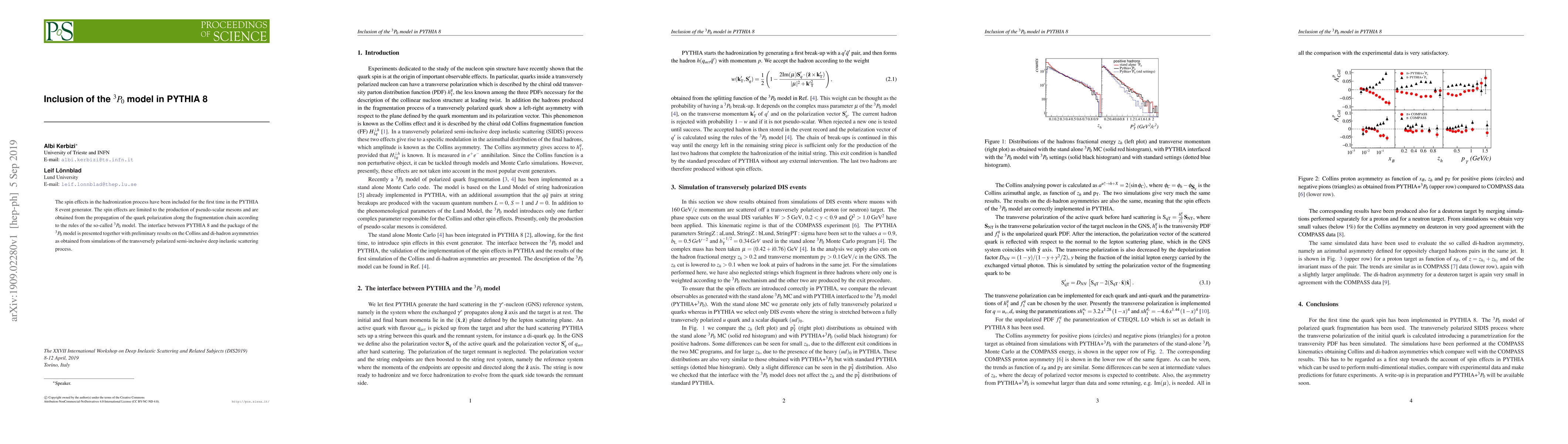 The spin effects in the hadronization process have been included for the first time in the PYTHIA 8 event generator. The spin effects are limited to the production of pseudo-scalar mesons and are obtained from the propagation of the quark polarization along the fragmentation chain according to the rules of the so-called $^3P_0$ model. The interface between PYTHIA 8 and the package of the $^3P_0$ model is presented together with preliminary results on the Collins and di-hadron asymmetries as obtained from simulations of the transversely polarized semi-inclusive deep inelastic scattering process.