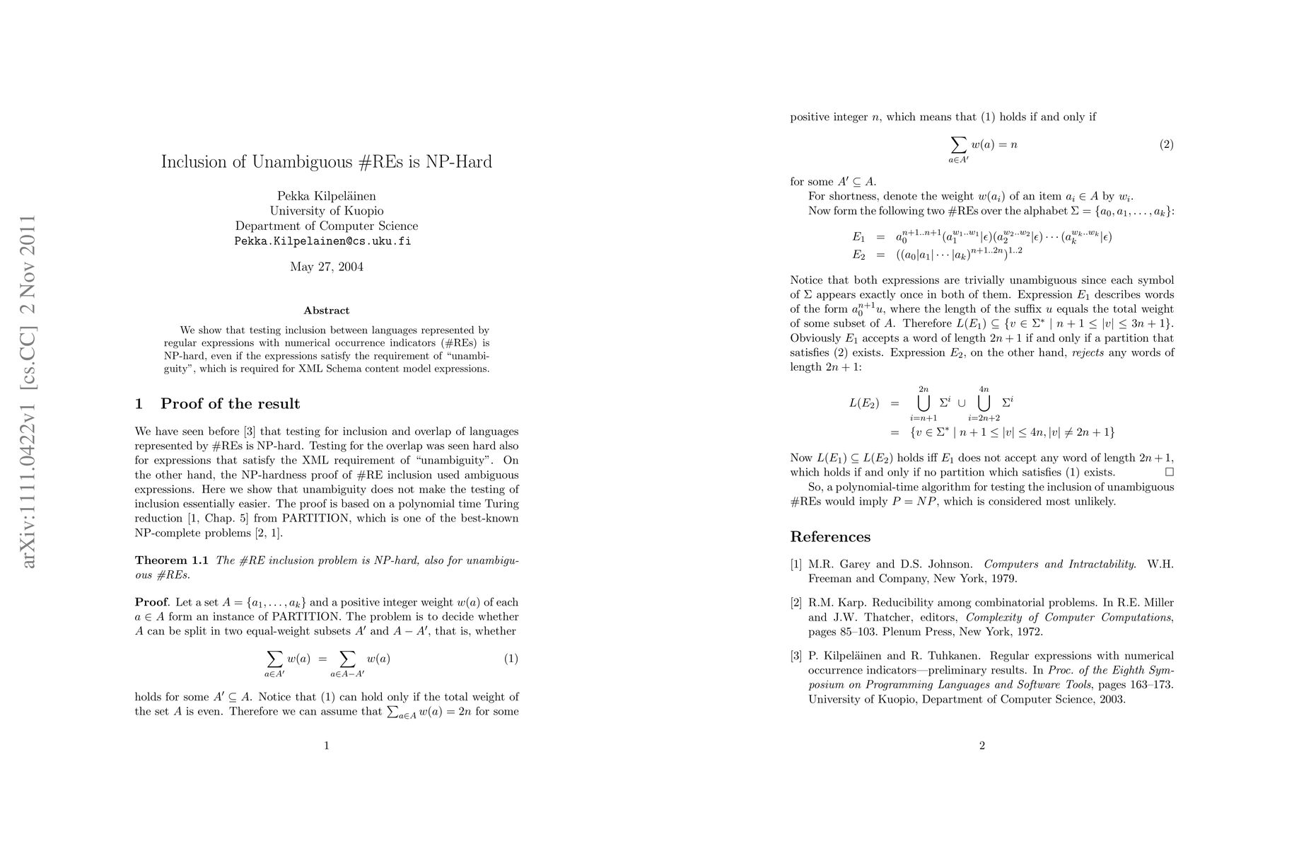 We show that testing inclusion between languages represented by regular expressions with numerical occurrence indicators (RE#s) is NP-hard, even if the expressions satisfy the requirement of "unambiguity", which is required for XML Schema content model expressions.