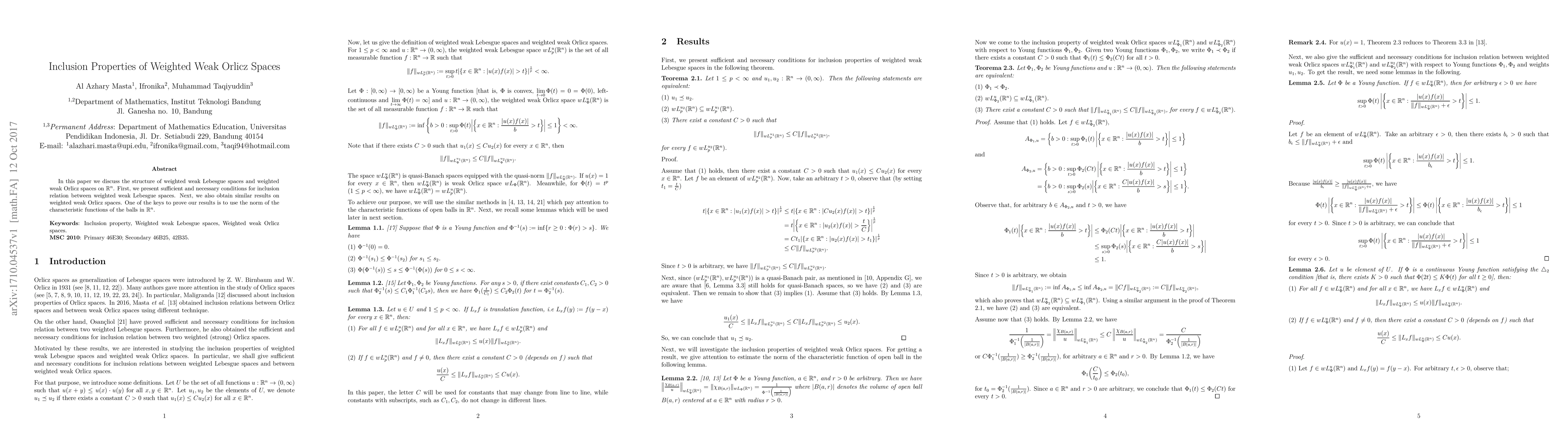 Summary: This paper establishes sufficient and necessary conditions for the inclusion of weighted weak Lebesgue spaces and weighted weak Orlicz spaces on $\mathbb{R}^n$, employing the norm of characteristic functions of balls to support the results.