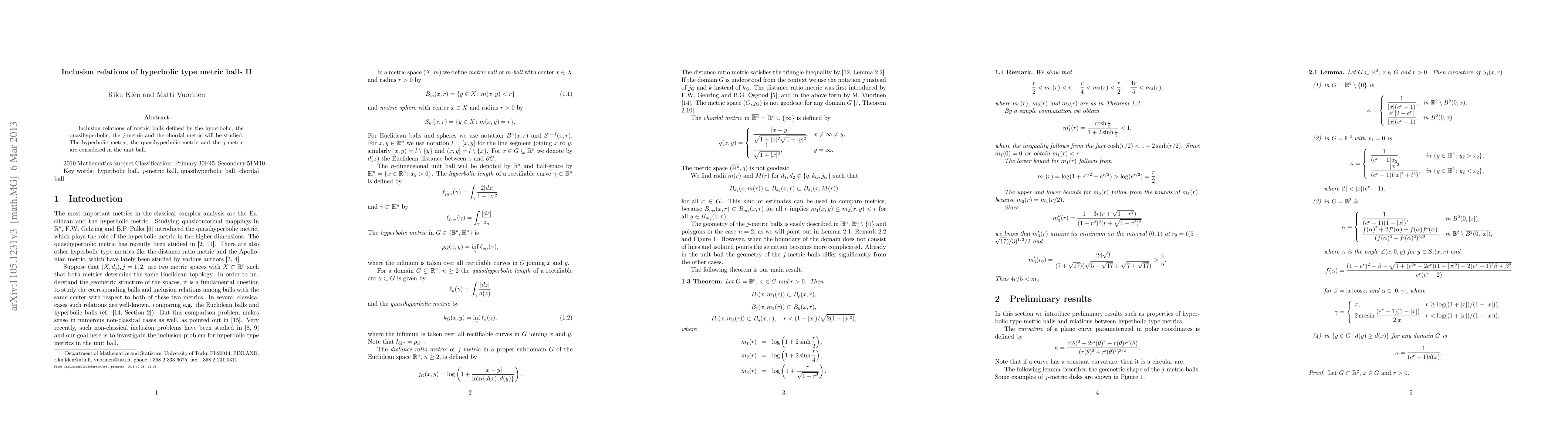 Inclusion relations of metric balls defined by the hyperbolic, the quasihyperbolic, the $j$-metric and the chordal metric will be studied. The hyperbolic metric, the quasihyperbolic metric and the $j$-metric are considered in the unit ball.
