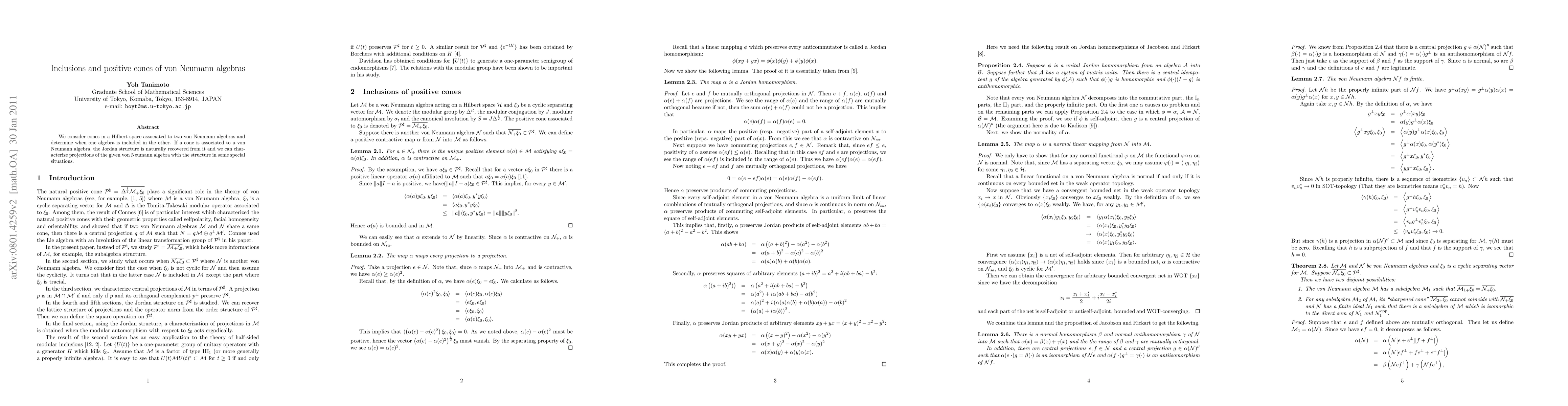 We consider cones in a Hilbert space associated to two von Neumann algebras and determine when one algebra is included in the other. If a cone is assocated to a von Neumann algebra, the Jordan structure is naturally recovered from it and we can characterize projections of the given von Neumann algebra with the structure in some special situations.