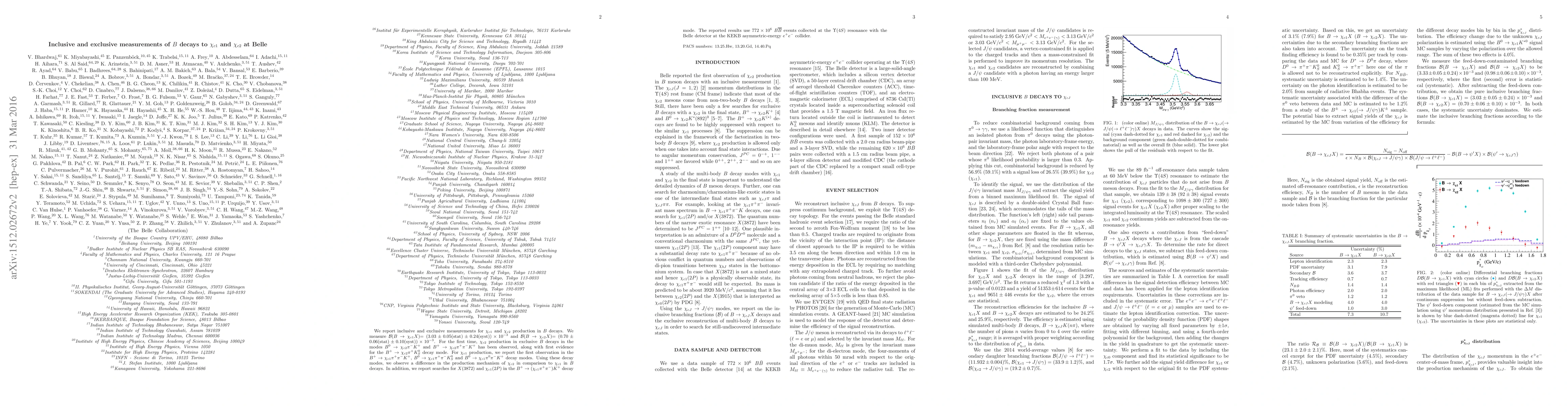 We report inclusive and exclusive measurements for $\chi_{c1}$ and $\chi_{c2}$ production in $B$ decays. We measure $\mathcal{B}(B \to \chi_{c1} X)$= $(3.03 \pm 0.05(\mbox{stat}) \pm 0.24(\mbox{syst})) \times 10^{-3}$ and $\mathcal{B}(B \to \chi_{c2} X)$= $(0.70 \pm 0.06(\mbox{stat}) \pm 0.10(\mbox{syst})) \times 10^{-3}$. For the first time, $\chi_{c2}$ production in exclusive $B$ decays in the modes $B^0 \to \chi_{c2}\pi^- K^+$ and $B^+ \to \chi_{c2} \pi^+ \pi^- K^+$ has been observed, along with first evidence for the $B^+ \to \chi_{c2} \pi^+ K_S^0$ decay mode. For $\chi_{c1}$ production, we report the first observation in the $B^+ \to \chi_{c1} \pi^+ \pi^- K^+$, $B^0 \to \chi_{c1} \pi^+ \pi^- K_S^0$ and $B^0 \to \chi_{c1} \pi^0 \pi^- K^+$ decay modes. Using these decay modes, we observe a difference in the production mechanism of $\chi_{c2}$ in comparison to $\chi_{c1}$ in $B$ decays. In addition, we report searches for $X(3872)$ and $\chi_{c1}(2P)$ in the $B^+ \to (\chi_{c1} \pi^+ \pi^-) K^+$ decay mode. The reported results use $772 \times 10^{6}$ $B\overline{B}$ events collected at the $\Upsilon(4S)$ resonance with the Belle detector at the KEKB asymmetric-energy $e^+e^-$ collider.