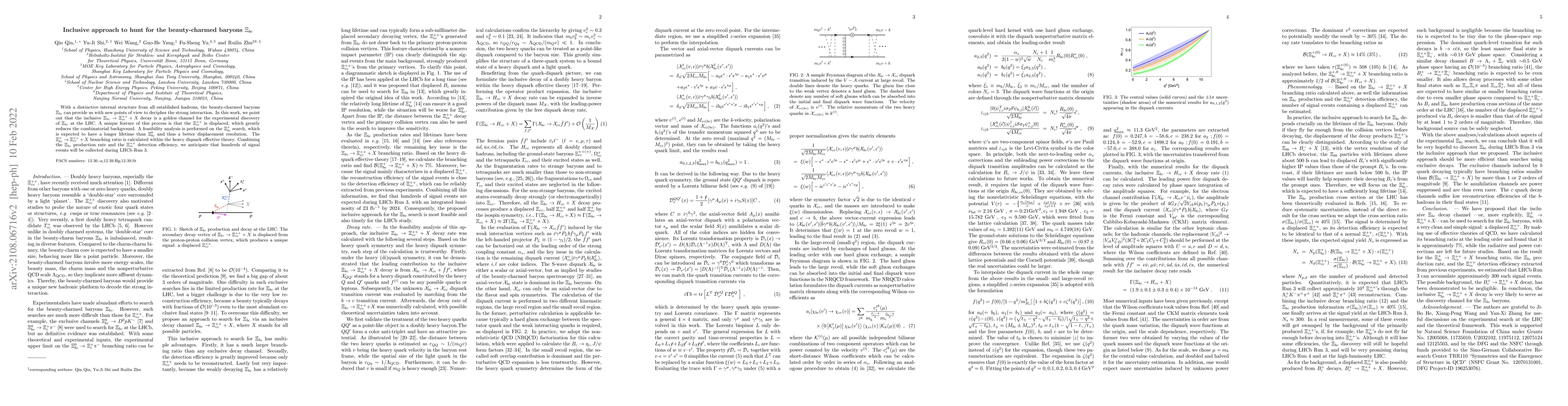 The research proposes an inclusive approach to search for the beauty-charmed baryons $\Xi_{bc}$ by analyzing the decay $\Xi_{bc}^+ \to \Xi_{cc}^{++} + X$, which results in a displaced $\Xi_{cc}^{++}$ that reduces combinatorial background.