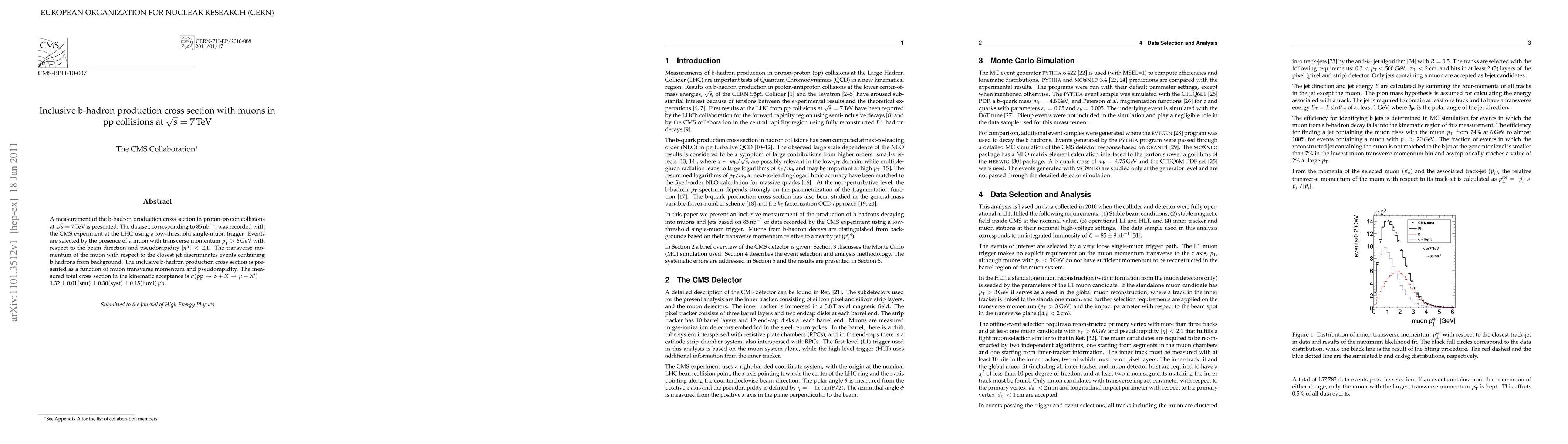 This paper reports a measurement of inclusive b-hadron production cross section in proton-proton collisions at 7 TeV using the CMS experiment at the LHC, focusing on events with muons. The total cross section is determined to be 1.32 ± 0.01 (stat) ± 0.30 (syst) ± 0.15 (lumi) microbarns.