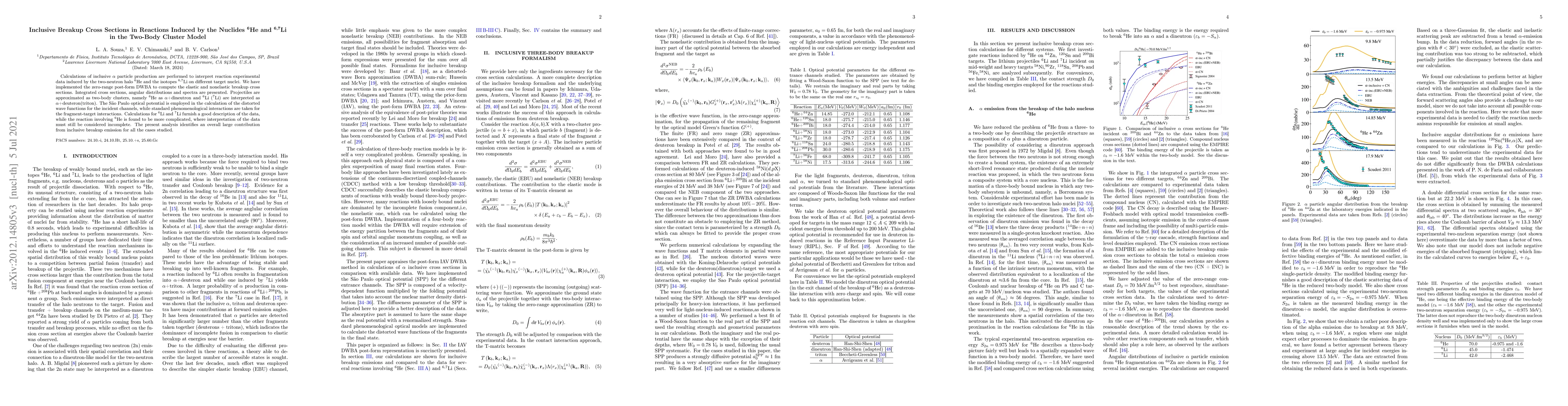 Calculations of inclusive ${\alpha}$ particle production are performed to interpret reaction experimental data induced by the two-neutron halo $^6$He and the isotopes $^{6,7}$Li on different target nuclei. We have implemented the zero-range post-form DWBA to compute the elastic and nonelastic breakup cross sections. Integrated cross sections, angular distributions and spectra are presented. Projectiles are approximated as two-body clusters, namely $^6$He as ${\alpha}$+dineutron and $^{6}$Li ($^{7}$Li) interpreted as ${\alpha}$+deuteron(triton). The S\~ao Paulo optical potential is employed in the calculation of the distorted wave functions for the incident channels, while standard phenomenological interactions are used for the fragment-target interactions. Calculations for $^6$Li and $^7$Li furnish a good description of the data, while the reaction involving $^6$He is found to be a complicated case, where data interpretation is still considered a major obstacle. The present analysis identifies an overall large contribution from inclusive breakup emissions for all the cases studied.