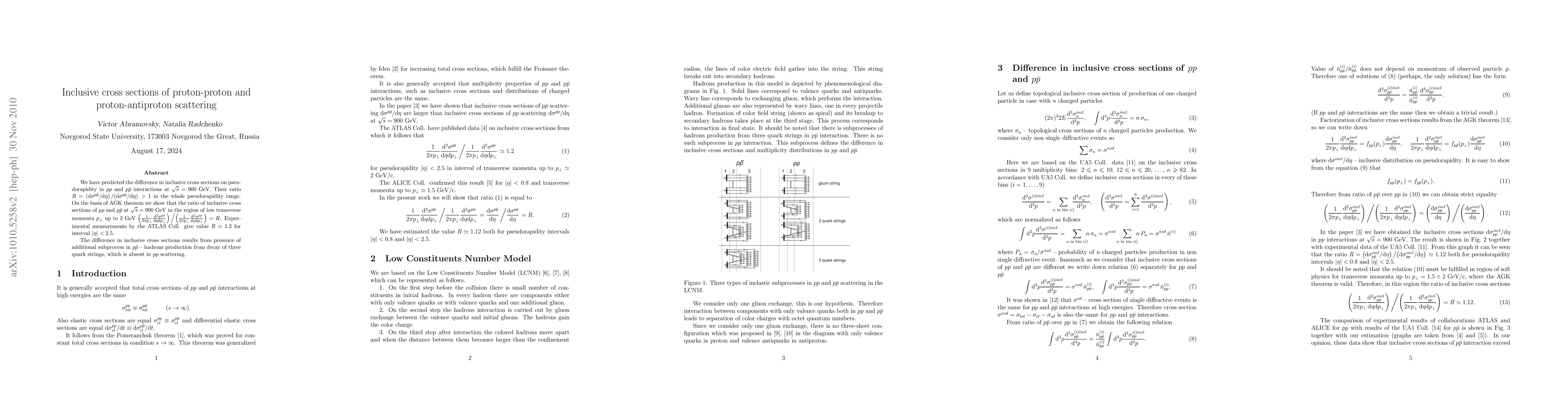 This study predicts a difference in inclusive cross sections between proton-proton and proton-antiproton interactions at $sqrt{s}=900$ GeV, with the ratio ${ m d}sigma^{par{p}}/{ m d}eta / { m d}sigma^{pp}/{ m d}eta > 1$ across pseudorapidity. The disparity originates from an extra subprocess in $par{p}$ hadron production via three-quark string decay, absent in $pp$ scattering. Experimental ATLAS data supports this, showing $R simeq 1.2$ for $|eta| < 2.5$.