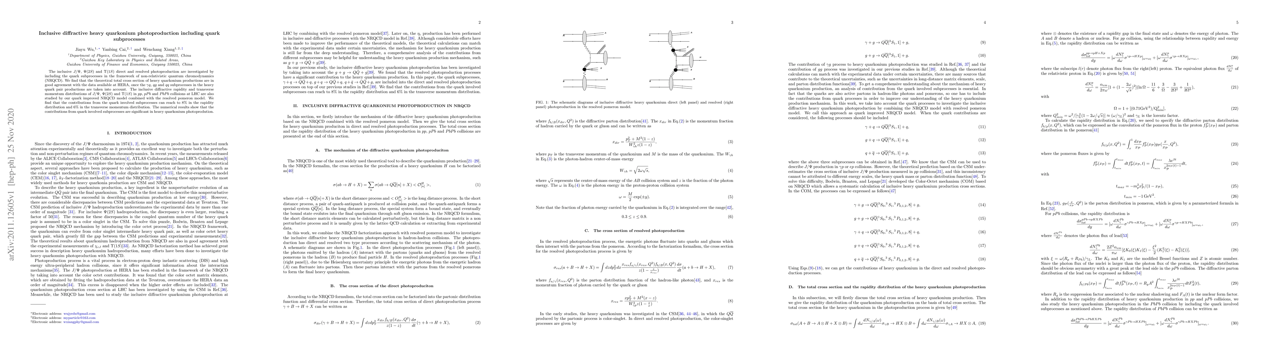 This paper investigates inclusive diffractive heavy quarkonium photoproduction, including quark subprocesses within the non-relativistic quantum chromodynamics (NRQCD) framework. The study finds that the theoretical cross sections align well with HERA data, and quark-involved subprocesses contribute up to 8% in rapidity and 6% in transverse momentum distributions in LHC collisions.