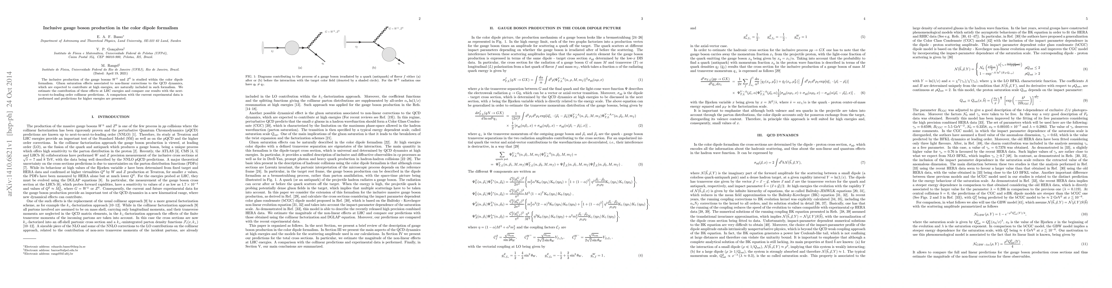 This paper investigates the inclusive production of $W^{\pm}$ and $Z^0$ gauge bosons using the color dipole formalism, incorporating gluon saturation effects. The study compares these effects at LHC energies with next-to-next-to-leading order collinear predictions and aligns results with current experimental data, while also projecting future higher energy predictions.