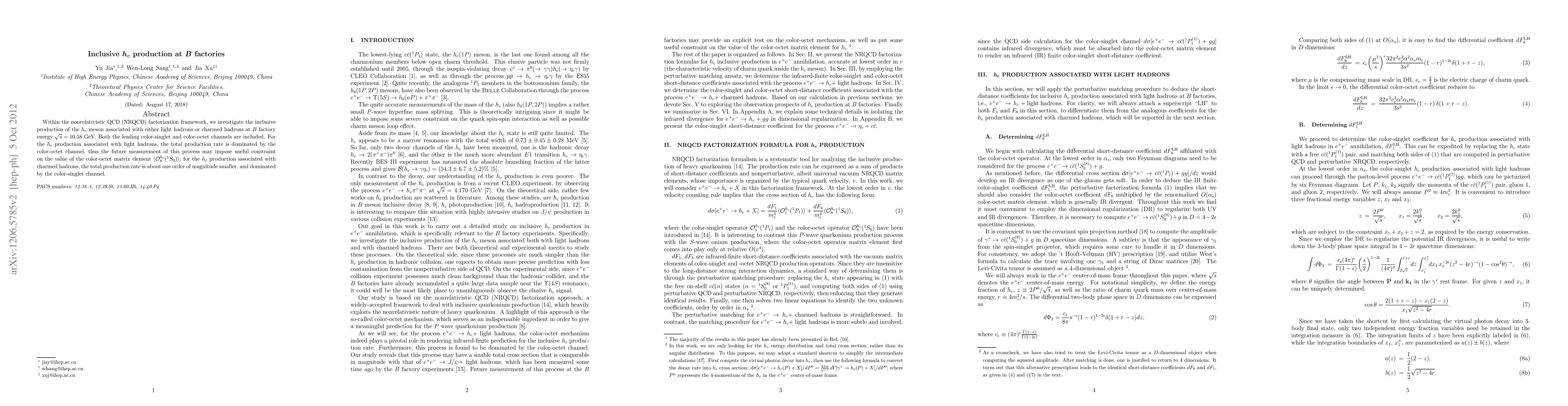 This study investigates the inclusive production of the $h_c$ meson within the NRQCD framework at $B$ factory energy, focusing on both color-singlet and color-octet channels. The production associated with light hadrons is mainly driven by the color-octet channel, while that with charmed hadrons is dominated by the color-singlet channel.