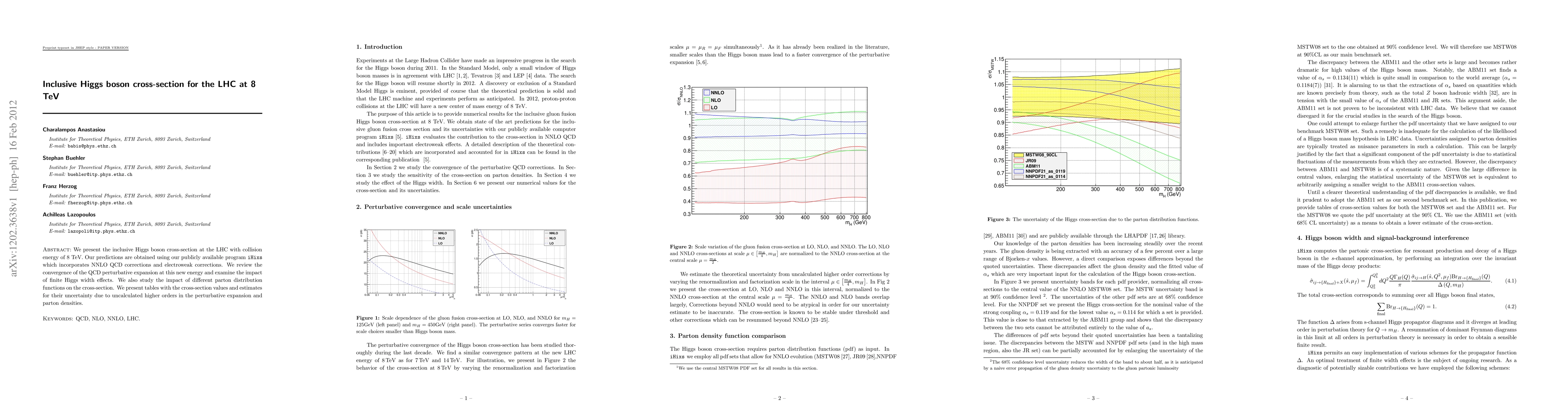 Researchers at the LHC predicted the inclusive Higgs boson cross-section at 8 TeV energy using a publicly available program, incorporating NNLO QCD corrections and electroweak effects, with results presented in tables including estimates of uncertainty.