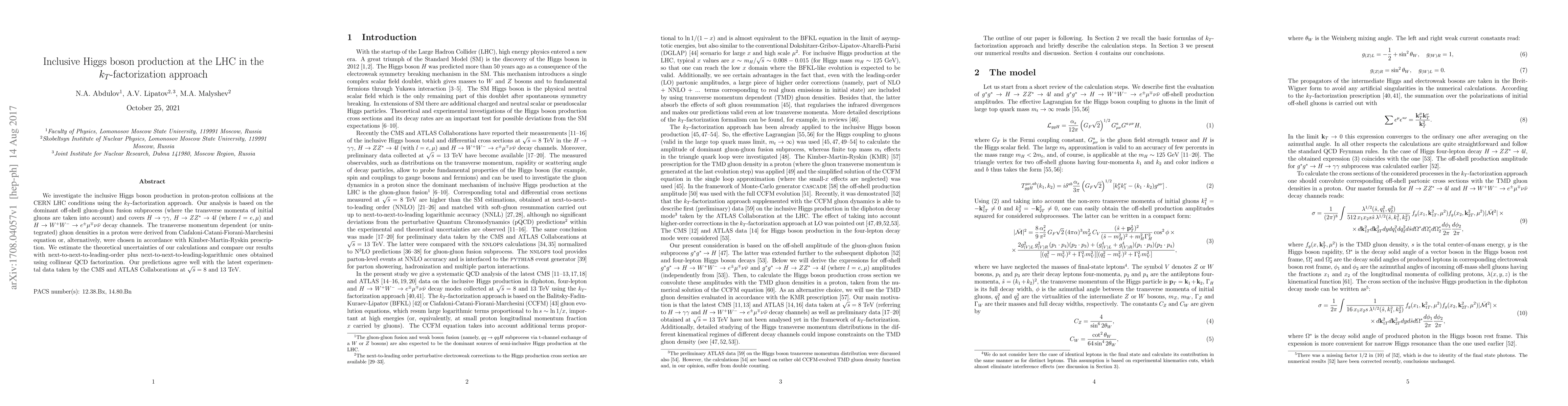 This paper studies inclusive Higgs boson production in proton-proton collisions at the LHC using the $k_T$-factorization approach, focusing on gluon-gluon fusion and various decay channels. The theoretical uncertainties and comparisons with next-to-next-to-leading-order QCD results are presented, showing good agreement with experimental data from CMS and ATLAS.