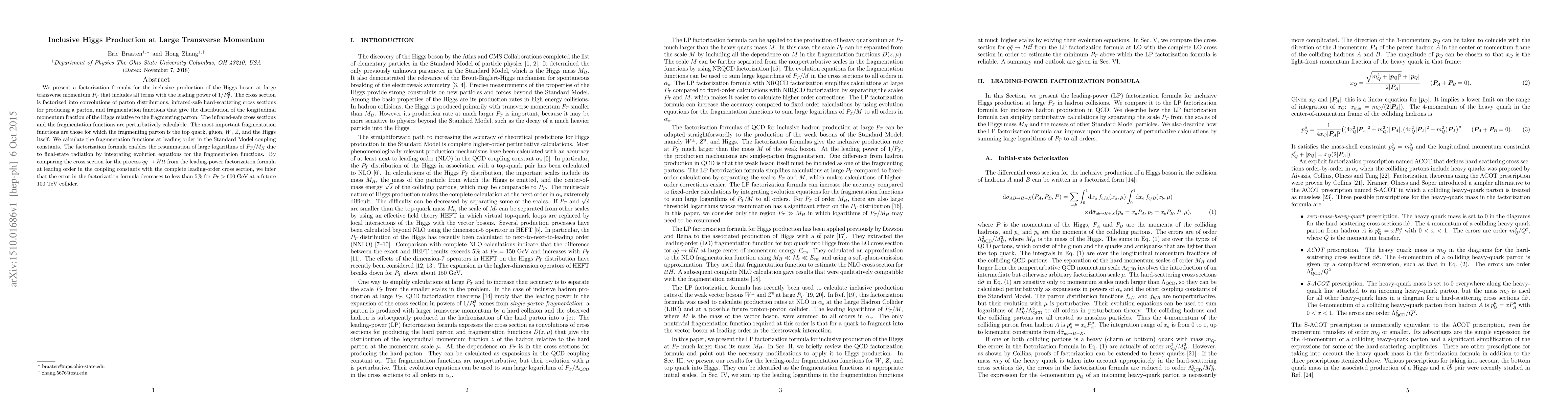 This research introduces a factorization formula for Higgs boson production at large transverse momentum, incorporating all leading terms of 1/P_T^2. It outlines a method to resum large logarithms of P_T/M_H through fragmentation function evolution, finding the formula's accuracy to be less than 5% for P_T>600 GeV at a 100 TeV collider.