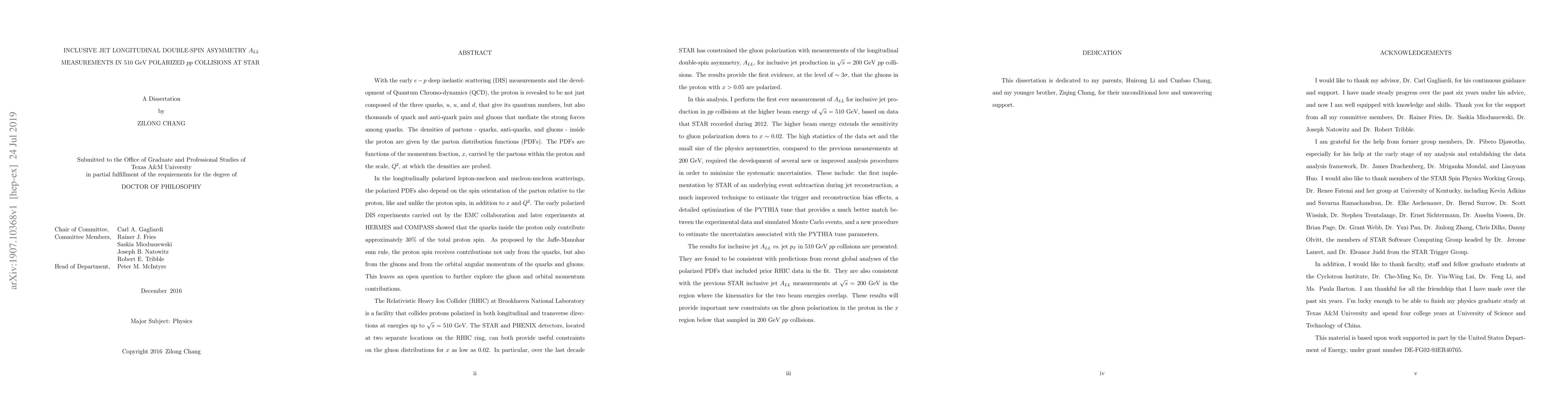 In this analysis, I perform the first ever measurement of \(A_{LL}\) for inclusive jet production in \(pp\) collisions at the higher beam energy of \(\sqrt{s}\) = 510 GeV, based on data that STAR recorded during 2012. The higher beam energy extends the sensitivity to gluon polarization down to \(x \sim 0.02\). The high statistics of the data set and the small size of the physics asymmetries, compared to the previous measurements at 200 GeV, required the development of several new or improved analysis procedures in order to minimize the systematic uncertainties. These include: the first implementation by STAR of an underlying event subtraction during jet reconstruction, a much improved technique to estimate the trigger and reconstruction bias effects, a detailed optimization of the PYTHIA tune that provides a much better match between the experimental data and simulated Monte Carlo events, and a new procedure to estimate the uncertainties associated with the PYTHIA tune parameters. The results for inclusive jet \(A_{LL}\) \textit{vs}.\@ jet \(p_T\) in 510 GeV \(pp\) collisions are presented. They are found to be consistent with predictions from recent global analyses of the polarized PDFs that included prior RHIC data in the fit. They are also consistent with the previous STAR inclusive jet \(A_{LL}\) measurements at \(\sqrt{s}\) = 200 GeV in the region where the kinematics for the two beam energies overlap. These results will provide important new constraints on the gluon polarization in the proton in the \(x\) region below that sampled in 200 GeV \(pp\) collisions.
