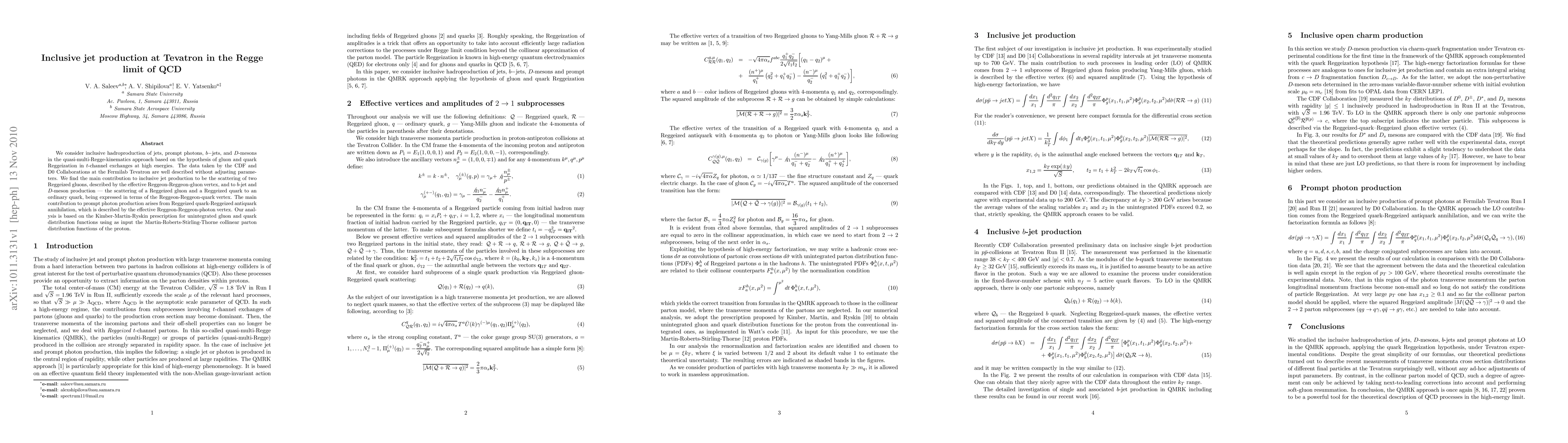 This paper investigates the inclusive production of jets, prompt photons, b-jets, and D-mesons in high-energy Tevatron collisions using the quasi-multi-Regge-kinematics approach, finding that the main contributions are from Reggeized gluon and quark scattering, well described by the CDF and D0 data without parameter adjustments. The analysis employs the Kimber-Martin-Ryskin prescription for unintegrated gluon and quark distribution functions.