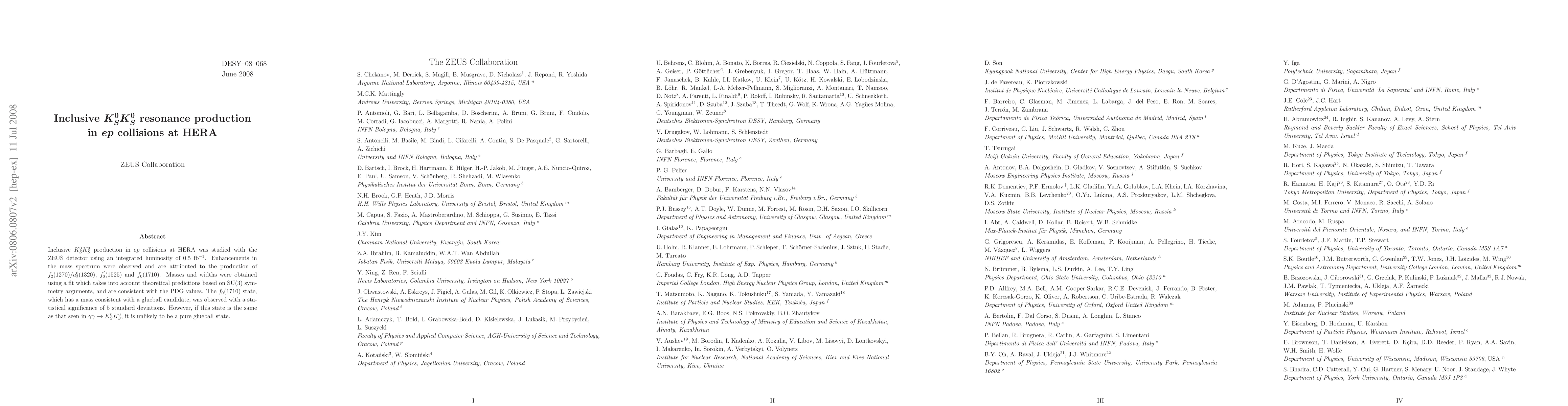 Researchers at HERA detected enhancements in K0SK0S mass spectrum attributed to production of f2(1270)/a02(1320), f'2(1525), and f0(1710) states, with the f0(1710) showing 5 standard deviations significance.