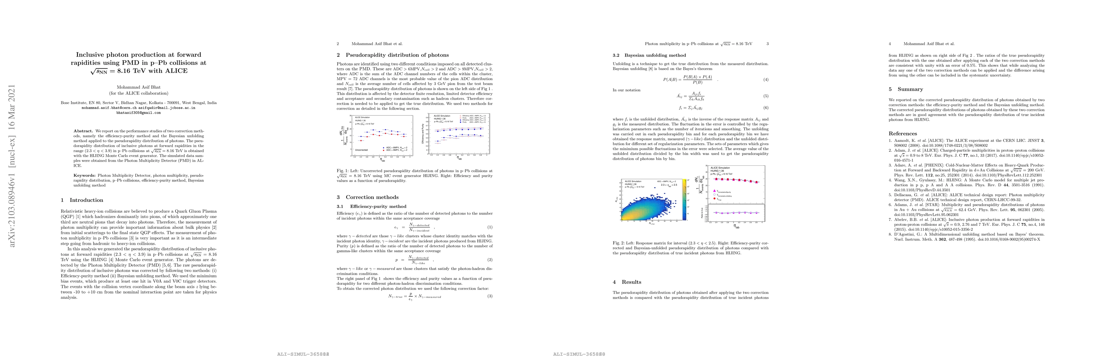 We report on the performance studies of two correction methods, namely the efficiency-purity method and the Bayesian unfolding method applied to the pseudorapidity distribution of photons. The pseudorapidity distribution of inclusive photons at forward rapidities in the range \mbox{\small $(2.3<\eta<3.9)$} in p\textendash Pb collisions at $\sqrt{\it{s}_{\rm{NN}}} = 8.16$ TeV is obtained with the HIJING Monte Carlo event generator. The simulated data samples were obtained from the Photon Multiplicity Detector (PMD) in ALICE.