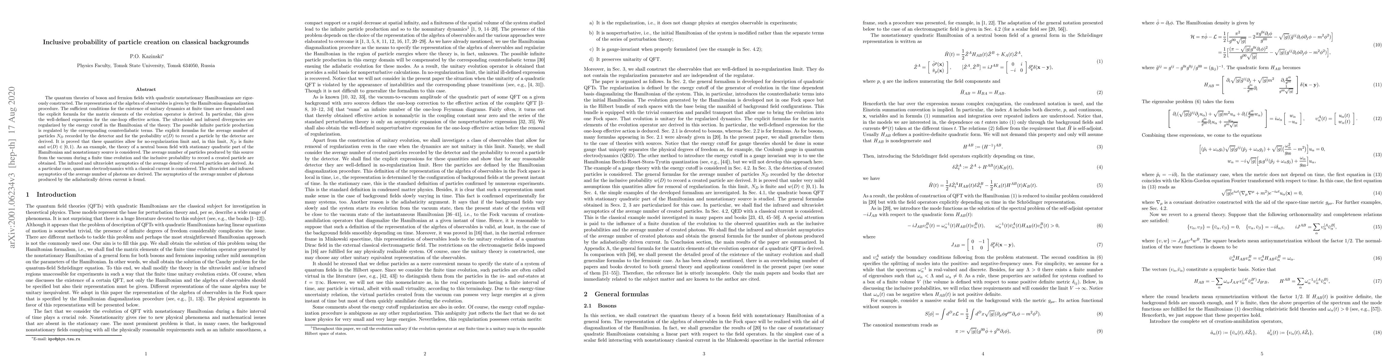The quantum theories of boson and fermion fields with quadratic nonstationary Hamiltoanians are rigorously constructed. The representation of the algebra of observables is given by the Hamiltonian diagonalization procedure. The sufficient conditions for the existence of unitary dynamics at finite times are formulated and the explicit formula for the matrix elements of the evolution operator is derived. In particular, this gives the well-defined expression for the one-loop effective action. The ultraviolet and infrared divergencies are regularized by the energy cutoff in the Hamiltonian of the theory. The possible infinite particle production is regulated by the corresponding counterdiabatic terms. The explicit formulas for the average number of particles $N_D$ recorded by the detector and for the probability $w(D)$ to record a particle by the detector are derived. It is proved that these quantities allow for the regularization removal limit and, in this limit, $N_D$ is finite and $w(D)\in[0,1)$. As an example, the theory of a neutral boson field with stationary quadratic part of the Hamiltonian and nonstationary source is considered. The average number of particles produced by this source from the vacuum during a finite time evolution and the inclusive probability to record a created particle are obtained. The infrared and ultraviolet asymptotics of the average density of created particles are derived. As a particular case, quantum electrodynamics with a classical current is considered. The ultraviolet and infrared asymptotics of the average number of photons are derived. The asymptotics of the average number of photons produced by the adiabatically driven current is found.