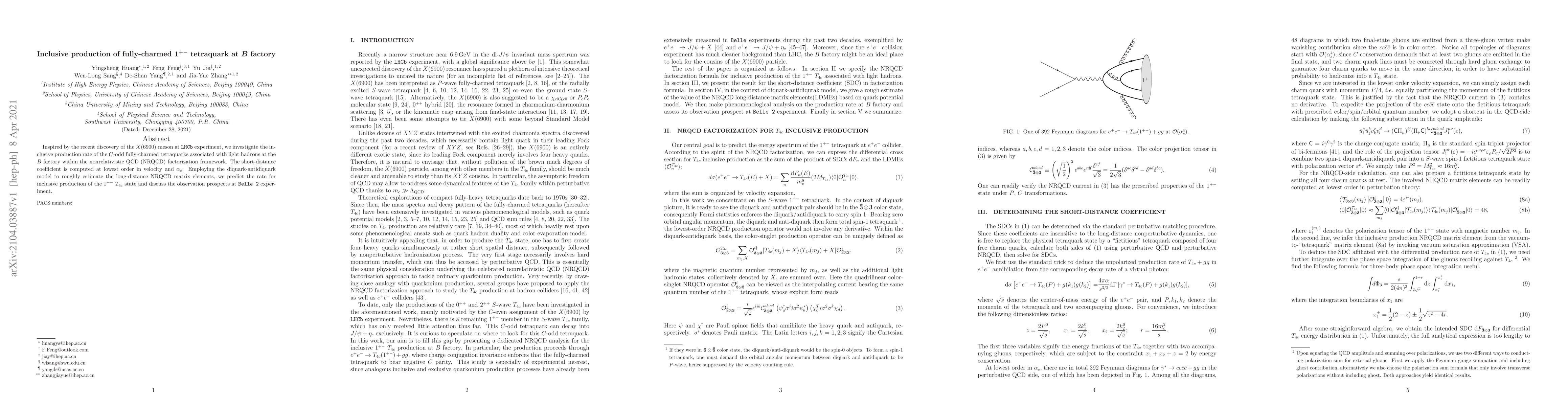 This paper explores the inclusive production rate of the fully-charmed $1^{+-}$ tetraquark ($T_{4c}$) at the $B$ factory, motivated by the discovery of the $X(6900)$ meson. Using the nonrelativistic QCD (NRQCD) framework, the authors predict the production rate and discuss its observability at the Belle 2 experiment.