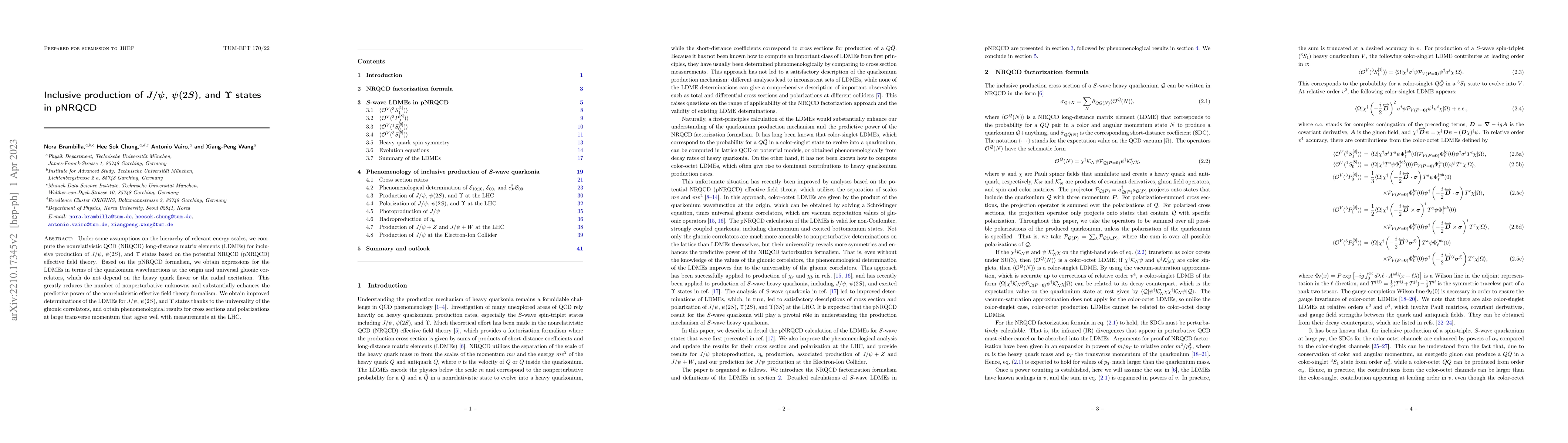 This paper computes long-distance matrix elements for inclusive production of $J/\psi$, $\psi(2S)$, and $\Upsilon$ states using the potential nonrelativistic QCD (pNRQCD) framework, achieving improved predictions by reducing nonperturbative unknowns through universal gluonic correlators. The results match well with LHC measurements.
