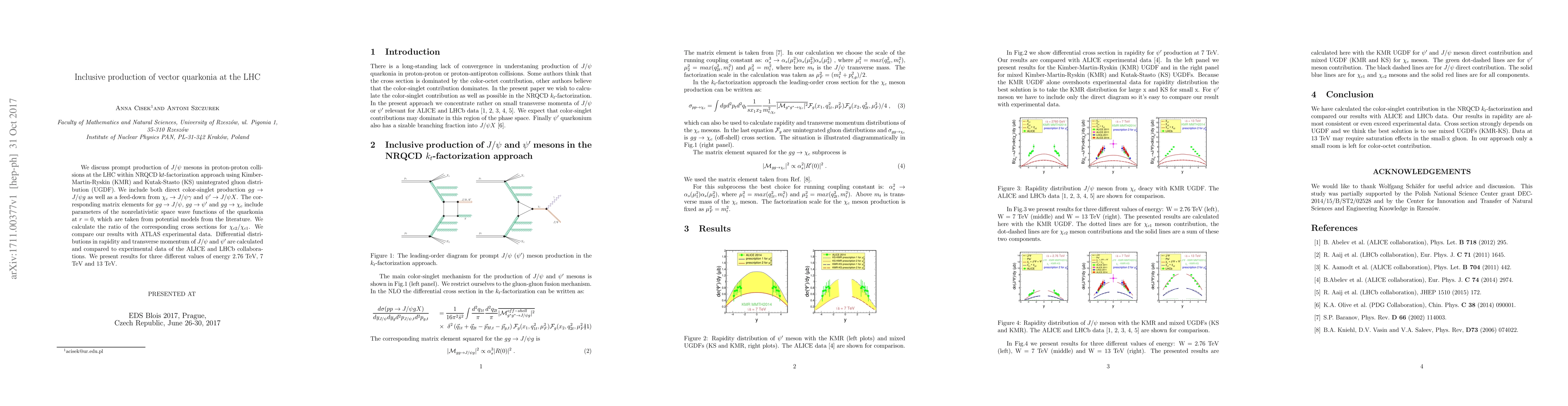 We discuss prompt production of $J/\psi$ mesons in proton-proton collisions at the LHC within NRQCD k$t$-factorization approach using Kimber-Martin-Ryskin (KMR) and Kutak-Stasto (KS) unintegrated gluon distribution (UGDF). We include both direct color-singlet production $gg \to J/\psi g$ as well as a feed-down from $\chi_{c} \to J/\psi \gamma$ and $\psi' \to J/\psi X$. The corresponding matrix elements for $gg \to J/\psi$, $gg \to \psi'$ and $gg \to \chi_{c}$ include parameters of the nonrelativistic space wave functions of the quarkonia at $r=0$, which are taken from potential models from the literature. We calculate the ratio of the corresponding cross sections for $\chi_{c2}/\chi_{c1}$. We compare our results with ATLAS experimental data. Differential distributions in rapidity and transverse momentum of $J/\psi$ and $\psi'$ are calculated and compared to experimental data of the ALICE and LHCb collaborations. We present results for three different values of energy 2.76 TeV, 7 TeV and 13 TeV.