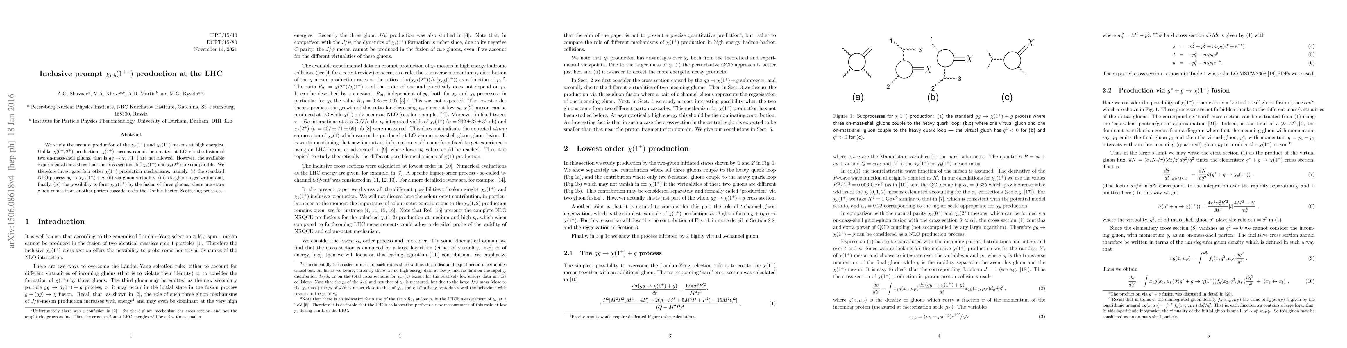 We study the prompt production of the $\chi_c(1^+)$ and $\chi_b(1^+)$ mesons at high energies. Unlike $\chi(0^+,2^+)$ production, $\chi (1^+)$ mesons cannot be created at LO via the fusion of two on-mass-shell gluons, that is $gg\to\chi_{c,b}(1^+)$ are not allowed. However, the available experimental data show that the cross sections for $\chi_c(1^+)$ and $\chi_c(2^+)$ are comparable. We therefore investigate four other $\chi(1^+)$ production mechanisms: namely, (i) the standard NLO process $gg\to\chi_{c,b}(1^+)+g$, (ii) via gluon virtuality, (iii) via gluon reggeization and, finally, (iv) the possibility to form $\chi_{c,b}(1^+)$ by the fusion of three gluons, where one extra gluon comes from another parton cascade, as in the Double Parton Scattering processes.