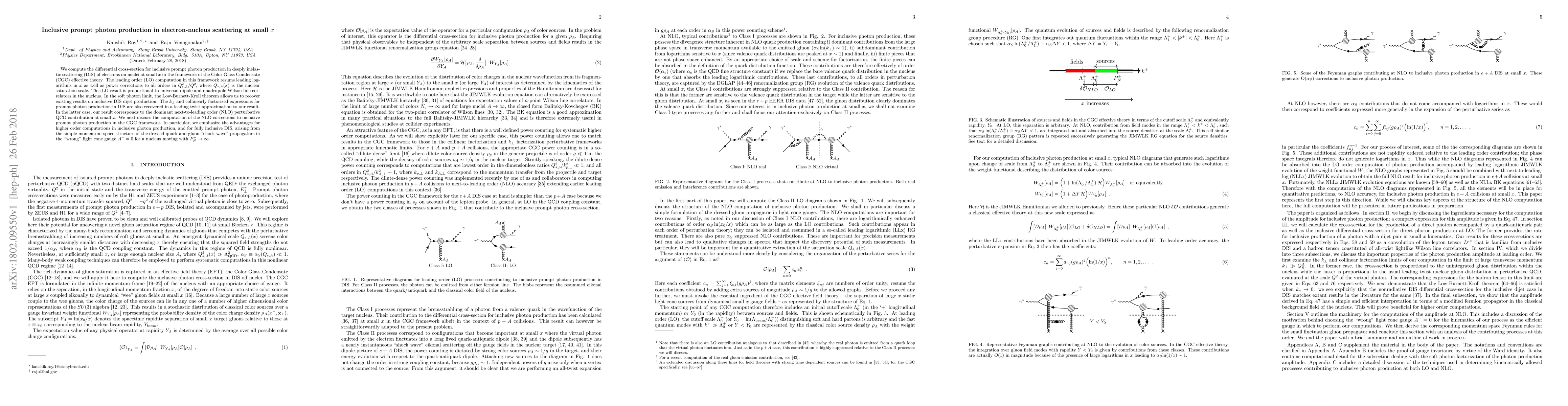 We compute the differential cross-section for inclusive prompt photon production in deeply inelastic scattering (DIS) of electrons on nuclei at small $x$ in the framework of the Color Glass Condensate (CGC) effective theory. The leading order (LO) computation in this framework resums leading logarithms in $x$ as well as power corrections to all orders in $Q_{s,A}^2/Q^2$, where $Q_{s,A}(x)$ is the nuclear saturation scale. This LO result is proportional to universal dipole and quadrupole Wilson line correlators in the nucleus. In the soft photon limit, the Low-Burnett-Kroll theorem allows us to recover existing results on inclusive DIS dijet production. The $k_{\perp}$ and collinearly factorized expressions for prompt photon production in DIS are also recovered in a leading twist approximation to our result. In the latter case, our result corresponds to the dominant next-to-leading order (NLO) perturbative QCD contribution at small $x$. We next discuss the computation of the NLO corrections to inclusive prompt photon production in the CGC framework. In particular, we emphasize the advantages for higher order computations in inclusive photon production, and for fully inclusive DIS, arising from the simple momentum space structure of the dressed quark and gluon "shock wave" propagators in the "wrong" light cone gauge $A^-=0$ for a nucleus moving with $P^{+}_{N} \rightarrow \infty$.