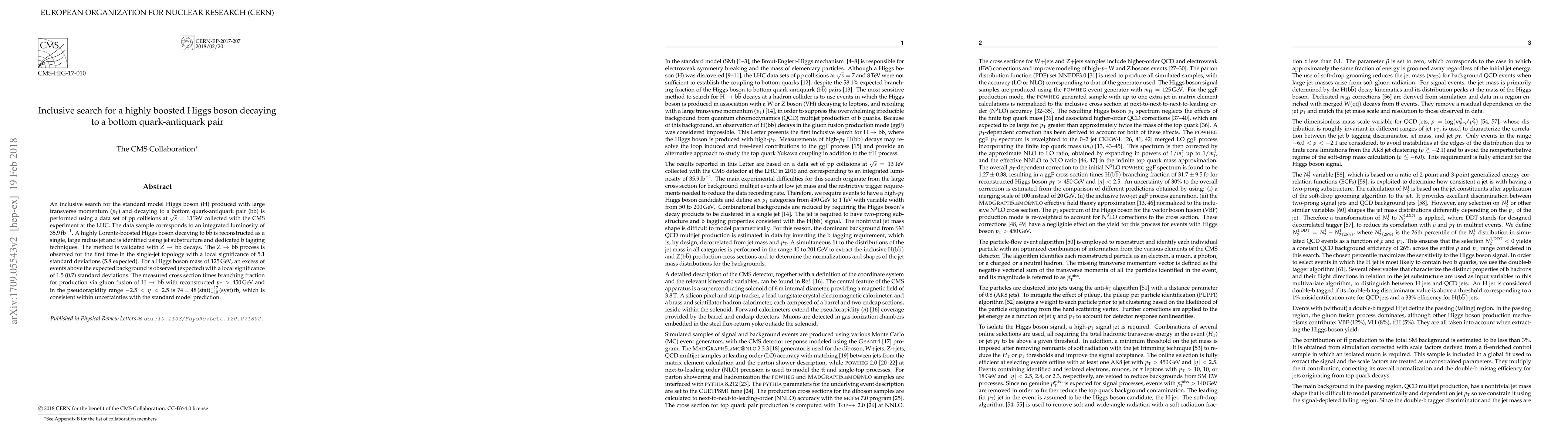 An inclusive search for the standard model Higgs boson ($\mathrm{H}$) produced with large transverse momentum ($p_\mathrm{T}$) and decaying to a bottom quark-antiquark pair ($\mathrm{b}\overline{\mathrm{b}}$) is performed using a data set of pp collisions at $\sqrt{s}=$ 13 TeV collected with the CMS experiment at the LHC. The data sample corresponds to an integrated luminosity of 35.9 fb$^{-1}$. A highly Lorentz-boosted Higgs boson decaying to $\mathrm{b}\overline{\mathrm{b}}$ is reconstructed as a single, large radius jet and is identified using jet substructure and dedicated $\mathrm{b}$ tagging techniques. The method is validated with $\mathrm{Z}\to\mathrm{b}\overline{\mathrm{b}}$ decays. The $\mathrm{Z}\to\mathrm{b}\overline{\mathrm{b}}$ process is observed for the first time in the single-jet topology with a local significance of 5.1 standard deviations (5.8 expected). For a Higgs boson mass of 125 GeV, an excess of events above the expected background is observed (expected) with a local significance of 1.5 (0.7) standard deviations. The measured cross section times branching fraction for production via gluon fusion of $\mathrm{H} \rightarrow \mathrm{b}\overline{\mathrm{b}}$ with $p_\mathrm{T} > $450 GeV and in the pseudorapidity range $-$2.5 $< \eta <$ 2.5 is 74 $\pm$ 48 (stat) $_{-10}^{+17}$ (syst) fb, which is consistent within uncertainties with the standard model prediction.