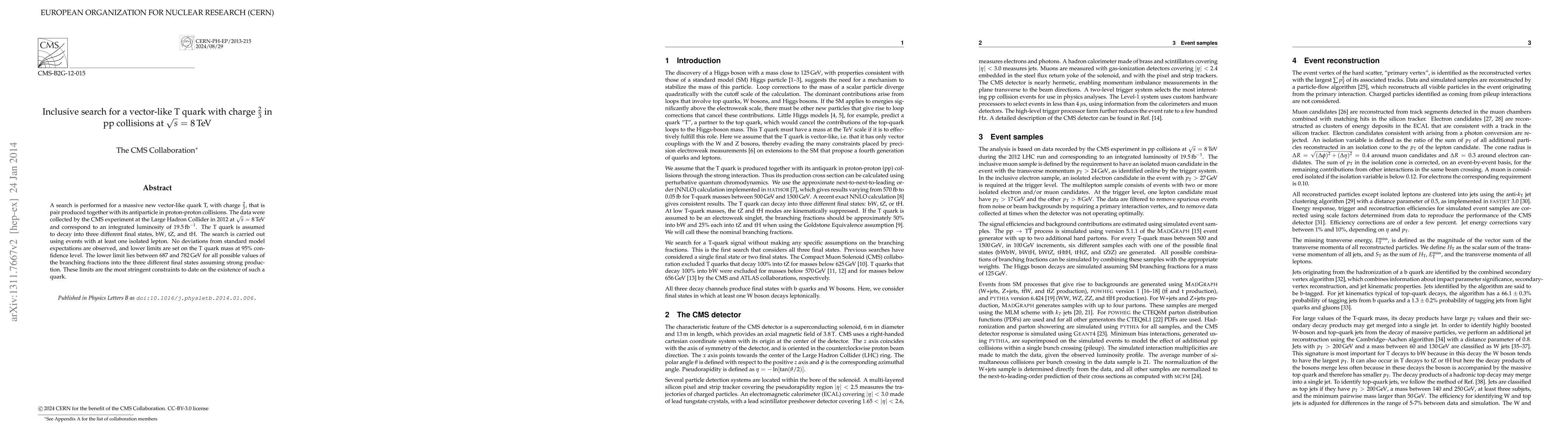 This paper reports an inclusive search for a vector-like T quark with charge 2/3 in proton-proton collisions at 8 TeV, using data from the CMS experiment. No evidence of the T quark is found, leading to the most stringent mass limits to date, ranging from 687 to 782 GeV.
