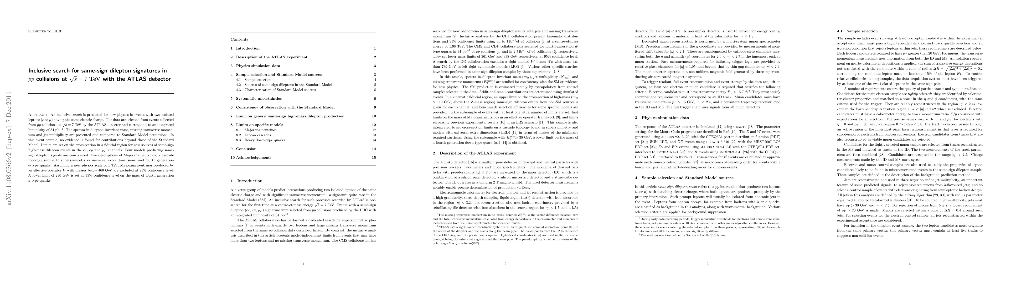 This paper reports an inclusive search for new physics in same-sign dilepton events from pp collisions at 7 TeV using the ATLAS detector, finding no evidence beyond Standard Model predictions and setting limits on several new physics models, including Majorana neutrinos and fourth generation down-type quarks.