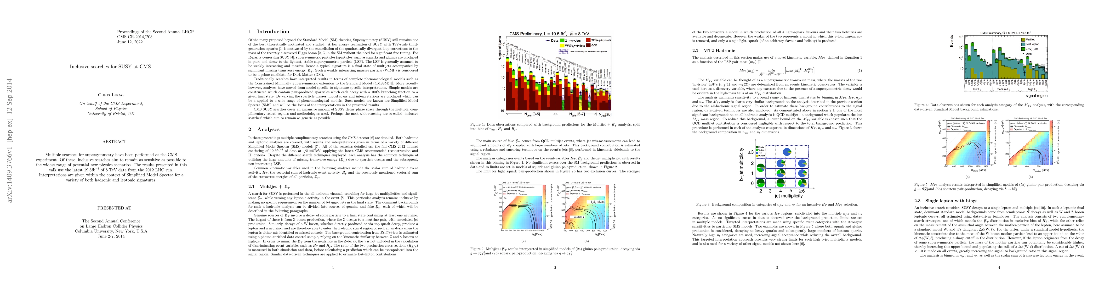 Multiple searches for supersymmetry have been performed at the CMS experiment. Of these, inclusive searches aim to remain as sensitive as possible to the widest range of potential new physics scenarios. The results presented in this talk use the latest 19.5 fb$^{-1}$ of 8 TeV data from the 2012 LHC run. Interpretations are given within the context of Simplified Model Spectra for a variety of both hadronic and leptonic signatures.