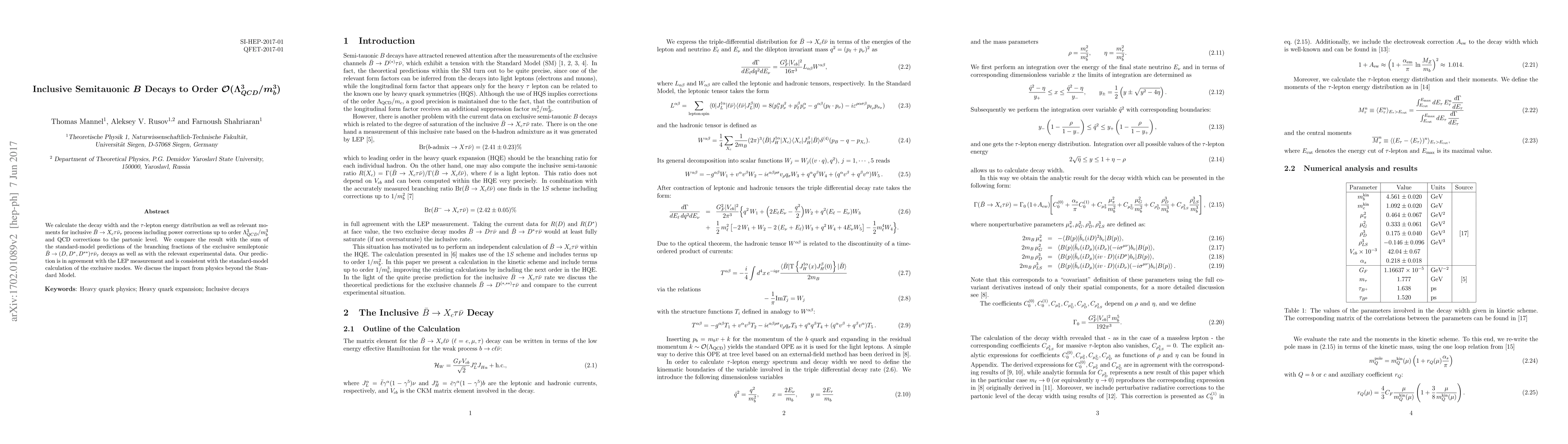 Researchers calculate inclusive semitauonic $B$ decays with corrections up to $rac{ ext{orders}}{ ext{magnetic moment}}$, comparing results with Standard Model predictions and experimental data, finding agreement with LEP measurement.
