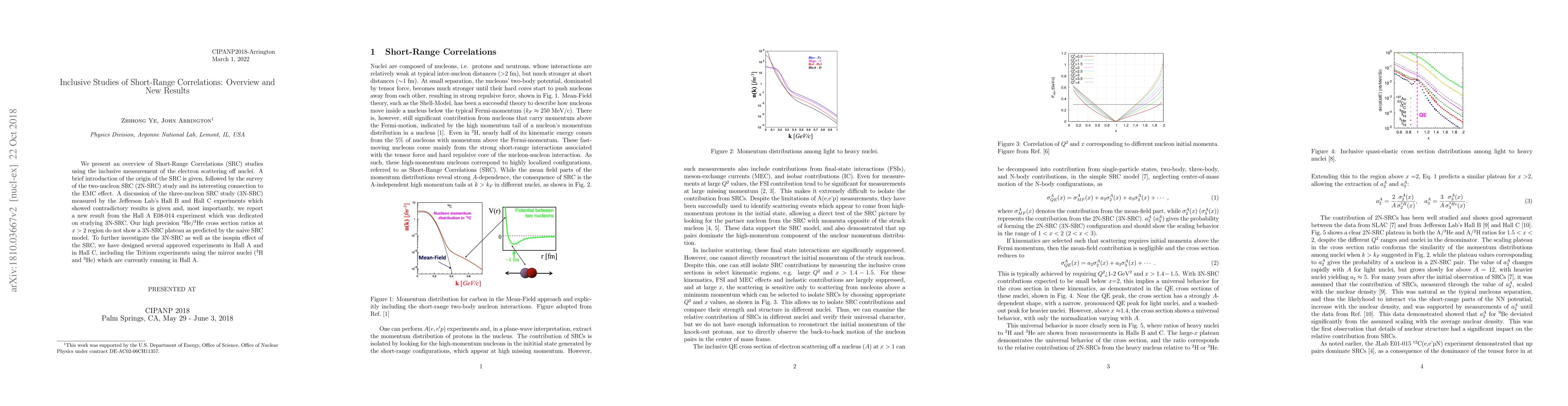 We present an overview of Short-Range Correlations (SRC) studies using the inclusive measurement of the electron scattering off nuclei. A brief introduction of the origin of the SRC is given, followed by the survey of the two-nucleon SRC (2N-SRC) study and its interesting connection to the EMC effect. A discussion of the three-nucleon SRC study (3N-SRC) measured by the Jefferson Lab's Hall B and Hall C experiments which showed contradictory results is given and, most importantly, we report a new result from the Hall A E08-014 experiment which was dedicated on studying 3N-SRC. Our high precision 4He/3He cross section ratios at the x > 2 region do not show a 3N-SRC plateau as predicted by the naive SRC model. To further investigate the 3N-SRC as well as the Isospin effect of the SRC, we have designed several approved experiments in Hall A and in Hall C, including the Tritium experiments using the mirror nuclei (3H and 3He) which are currently running in Hall A.