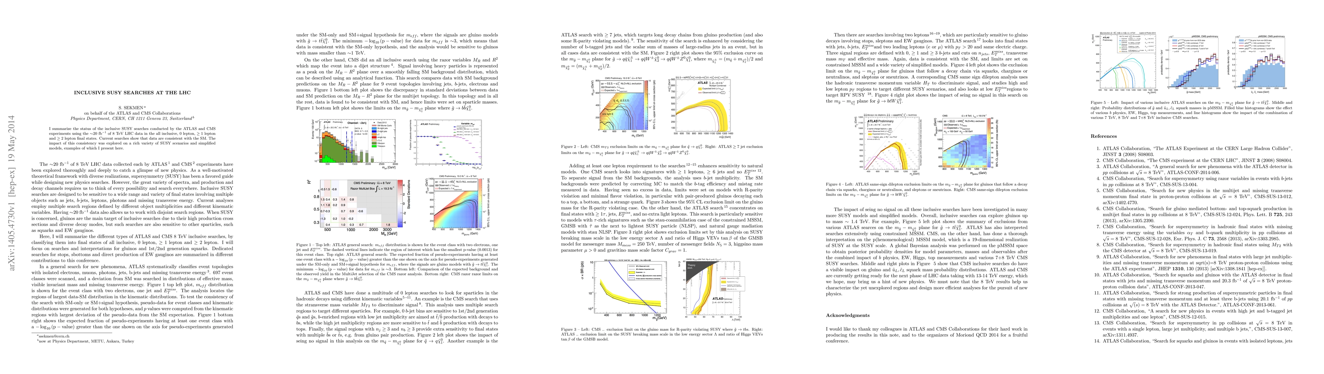 This paper reviews inclusive SUSY searches by ATLAS and CMS at the LHC using 20 fb-1 of 8 TeV data, finding no evidence for supersymmetry beyond the Standard Model (SM). The results are consistent with the SM and have implications for various SUSY scenarios and simplified models.