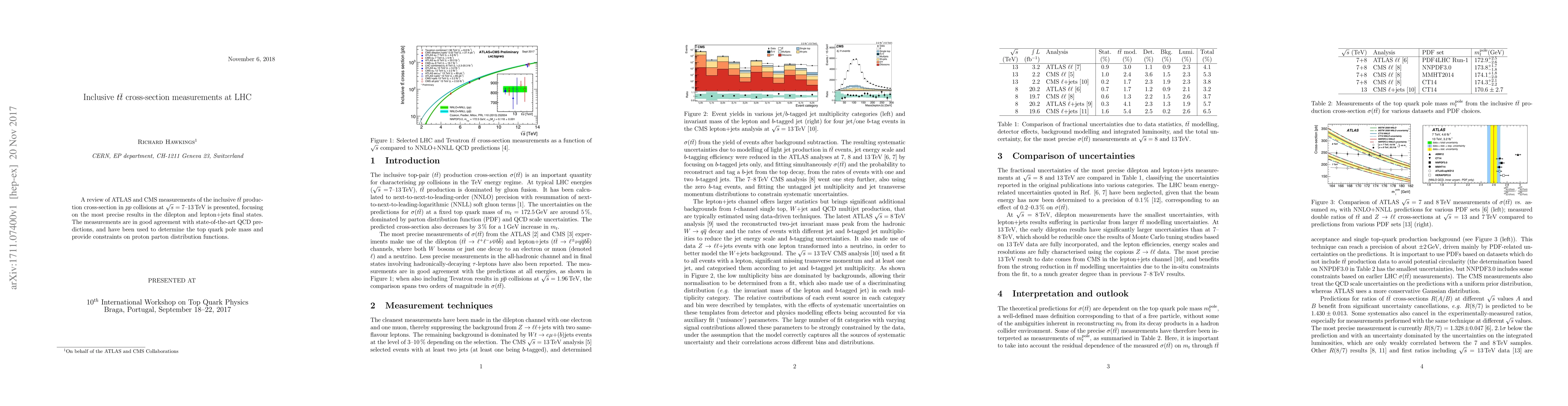 This paper reviews inclusive top-antitop ($t\bar{t}$) cross-section measurements from the ATLAS and CMS experiments at the LHC, confirming precise results in dilepton and lepton+jets channels that align with QCD predictions and aiding in top quark mass determination and proton parton distribution function constraints.