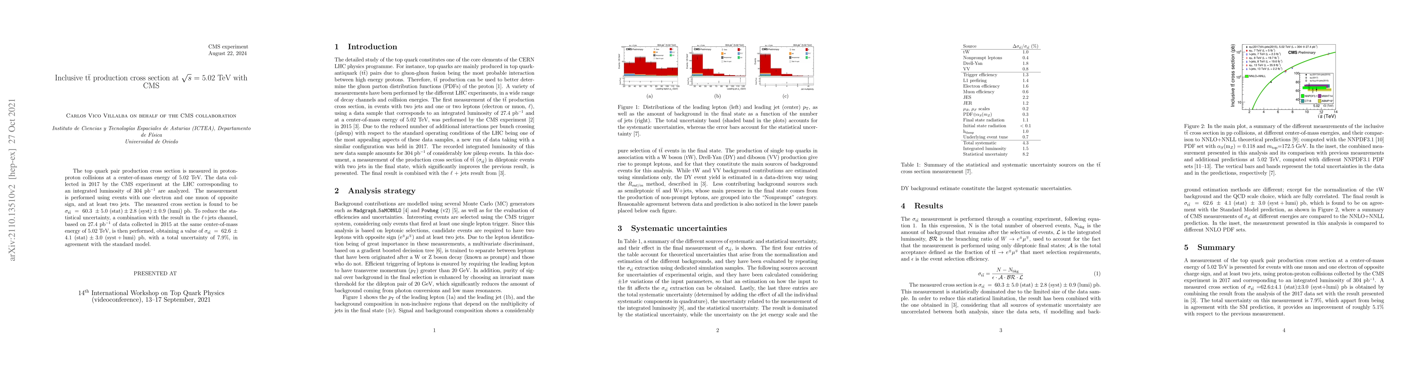The top quark pair production cross section is measured in proton-proton collisions at a center-of-mass energy of 5.02 TeV. The data collected in 2017 by the CMS experiment at the LHC corresponding to an integrated luminosity of 304 pb$^{-1}$ are analyzed. The measurement is performed using events with one electron and one muon of opposite sign, and at least two jets. The measured cross section is found to be $\sigma_{\mathrm{t}\bar{\mathrm{t}}}~=~60.3~\pm5.0~\mathrm{(stat)}\pm2.8~\mathrm{(syst)}\pm0.9~\mathrm{(lumi)}$ pb. To reduce the statistical uncertainty, a combination with the result in the $\ell$+jets channel, based on 27.4 pb$^{-1}$ of data collected in 2015 at the same center-of-mass energy of 5.02 TeV, is then performed, obtaining a value of $\sigma_{\mathrm{t}\bar{\mathrm{t}}}~=~62.6~\pm4.1~\mathrm{(stat)}\pm3.0~\mathrm{(syst+lumi)}$ pb, with a total uncertainty of 7.9%, in agreement with the standard model.