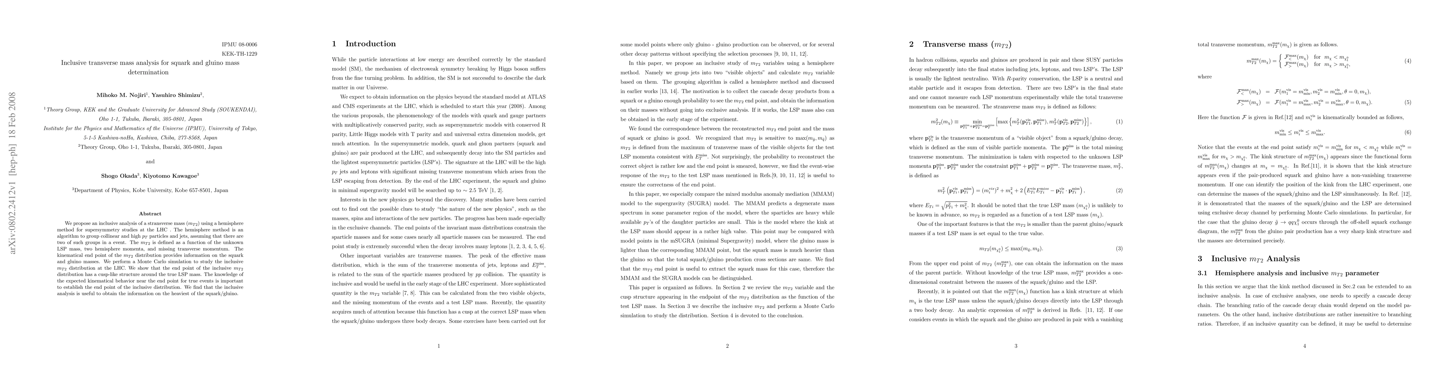 We propose an inclusive analysis of a stransverse mass (m_{T2}) using a hemisphere method for supersymmetry studies at the LHC . The hemisphere method is an algorithm to group collinear and high p_T particles and jets, assuming that there are two of such groups in a event. The m_{T2} is defined as a function of the unknown LSP mass, two hemisphere momenta, and missing transverse momentum. The kinematical end point of the m_{T2} distribution provides information on the squark and gluino masses. We perform a Monte Carlo simulation to study the inclusive m_{T2} distribution at the LHC. We show that the end point of the inclusive m_{T2} distribution has a cusp-like structure around the true LSP mass. The knowledge of the expected kinematical behavior near the end point for true events is important to establish the end point of the inclusive distribution. We find that the inclusive analysis is useful to obtain the information on the heaviest of the squark/gluino.