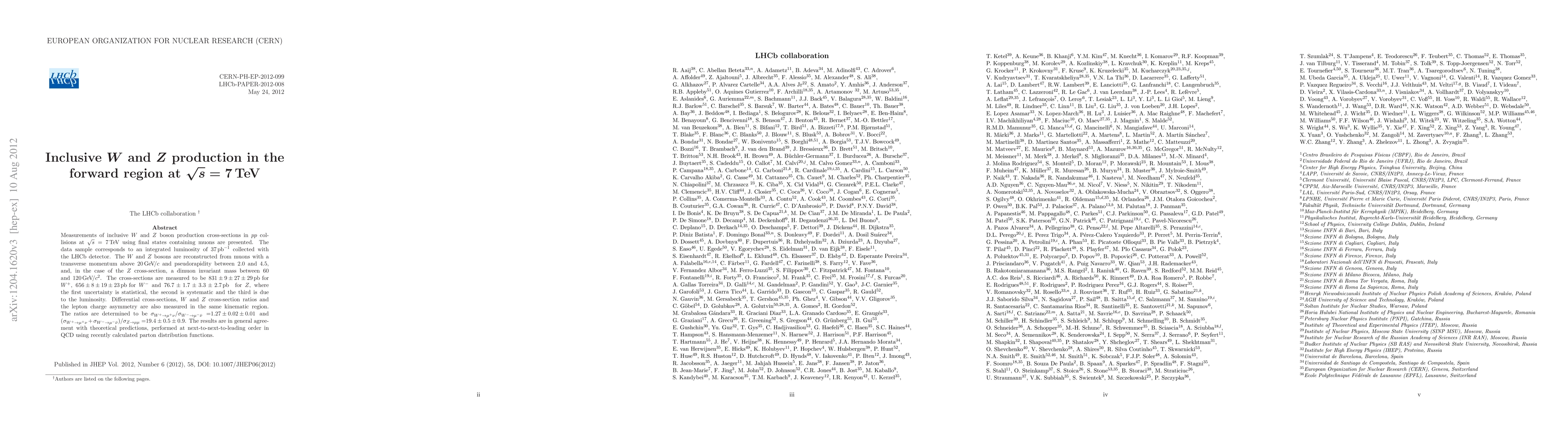 This paper presents measurements of inclusive $W$ and $Z$ boson production cross-sections in $pp$ collisions at $\sqrt{s}=7$ TeV using the LHCb detector, with results showing good agreement with theoretical predictions. The cross-sections for $W^+$, $W^-$, and $Z$ are reported to be $831\pm9\pm27\pm 29$ pb, $656\pm8\pm19\pm 23$ pb, and $76.7\pm1.7\pm3.3\pm2.7$ pb, respectively.