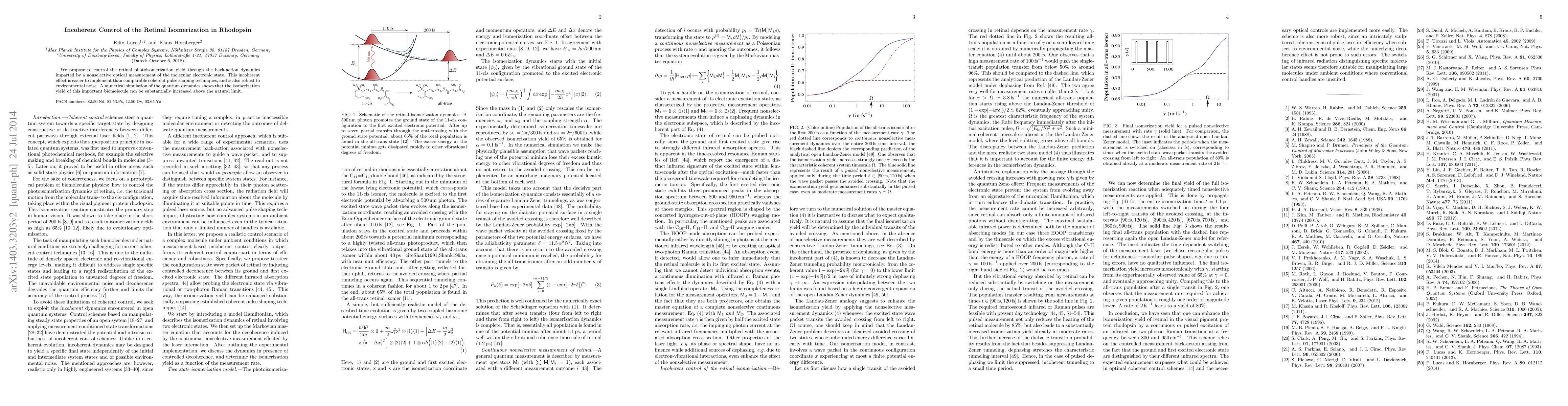 We propose to control the retinal photoisomerization yield through the back-action dynamics imparted by a nonselective optical measurement of the molecular electronic state. This incoherent effect is easier to implement than comparable coherent pulse shaping techniques, and is also robust to environmental noise. A numerical simulation of the quantum dynamics shows that the isomerization yield of this important biomolecule can be substantially increased above the natural limit.