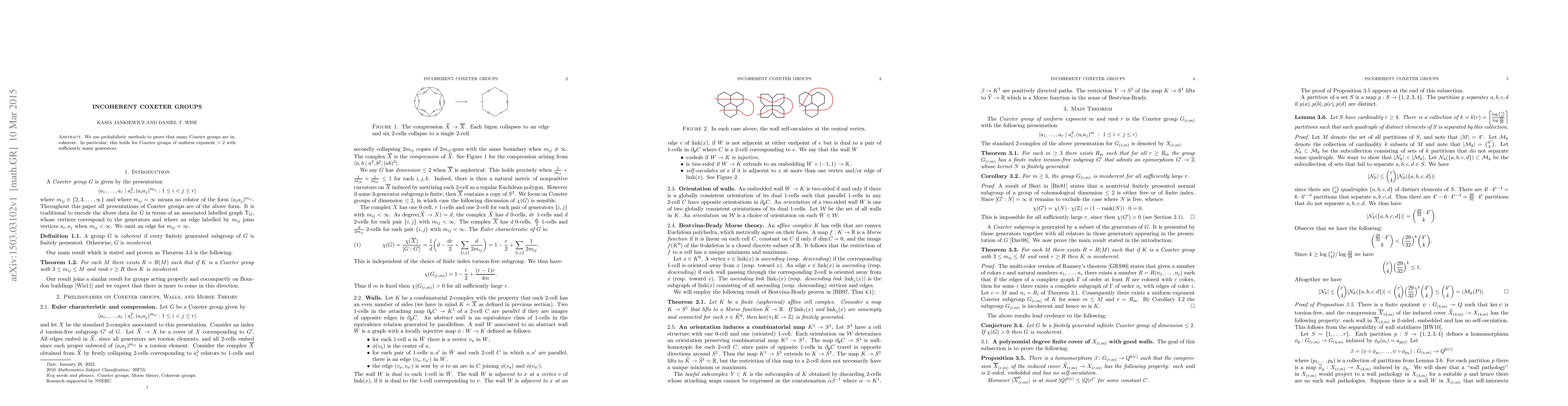 Summary: The paper employs probabilistic techniques to demonstrate that numerous Coxeter groups with a uniform exponent greater than 2 and a large number of generators are incoherent. This provides significant insight into the structural properties of such groups.