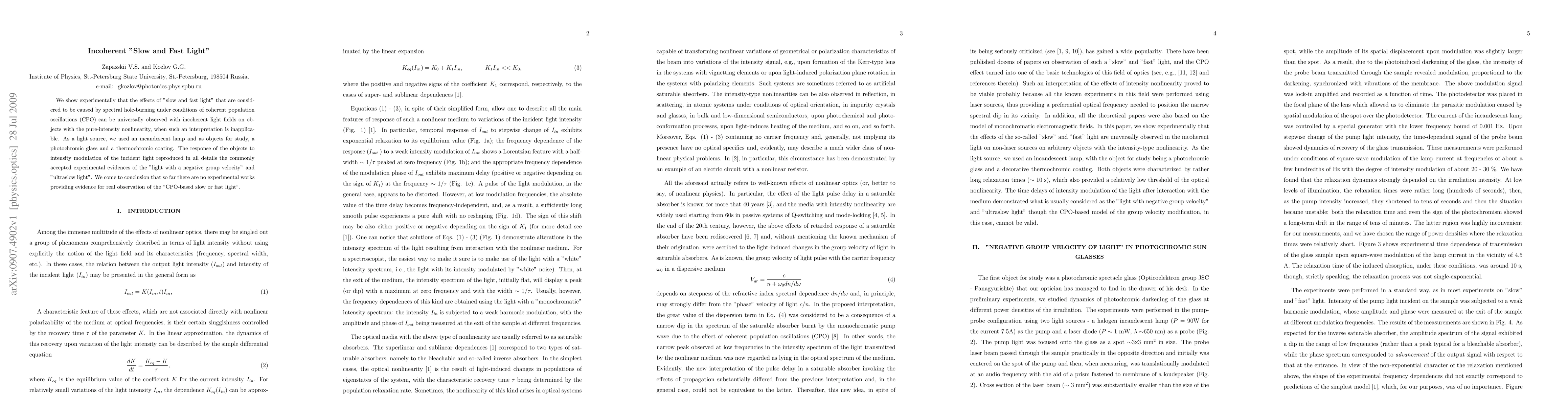 This paper demonstrates that "slow and fast light" effects, previously attributed to coherent population oscillations, can also occur with incoherent light sources like an incandescent lamp, due to pure-intensity nonlinearity in materials such as photochromic glass and thermochromic coatings. It concludes that no experimental evidence supports the existence of "CPO-based slow or fast light."