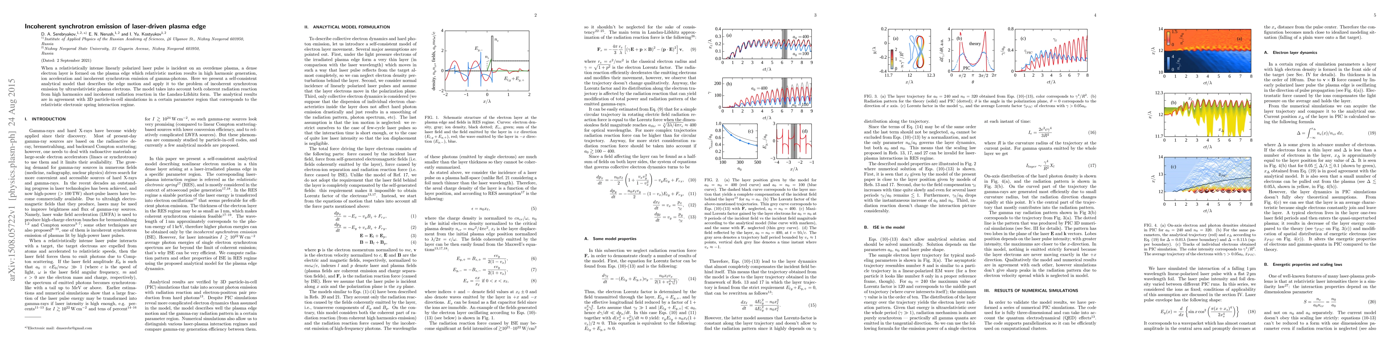 When a relativistically intense linearly polarized laser pulse is incident on an overdense plasma, a dense electron layer is formed on the plasma edge which relativistic motion results in high harmonic generation, ion acceleration and incoherent synchrotron emission of gamma-photons. Here we present a self-consistent analytical model that describes the edge motion and apply it to the problem of incoherent synchrotron emission by ultrarelativistic plasma electrons. The model takes into account both coherent radiation reaction from high harmonics and incoherent radiation reaction in the Landau-Lifshitz form. The analytical results are in agreement with 3D particle-in-cell simulations in a certain parameter region that corresponds to the relativistic electronic spring interaction regime.