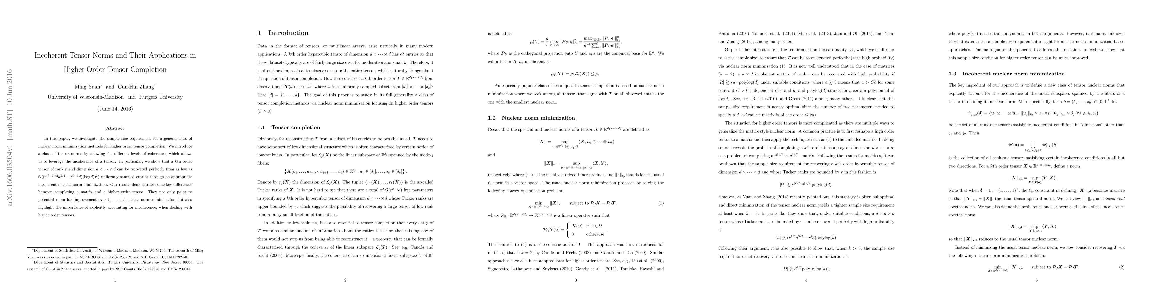 In this paper, we investigate the sample size requirement for a general class of nuclear norm minimization methods for higher order tensor completion. We introduce a class of tensor norms by allowing for different levels of coherence, which allows us to leverage the incoherence of a tensor. In particular, we show that a $k$th order tensor of rank $r$ and dimension $d\times\cdots\times d$ can be recovered perfectly from as few as $O((r^{(k-1)/2}d^{3/2}+r^{k-1}d)(\log(d))^2)$ uniformly sampled entries through an appropriate incoherent nuclear norm minimization. Our results demonstrate some key differences between completing a matrix and a higher order tensor: They not only point to potential room for improvement over the usual nuclear norm minimization but also highlight the importance of explicitly accounting for incoherence, when dealing with higher order tensors.